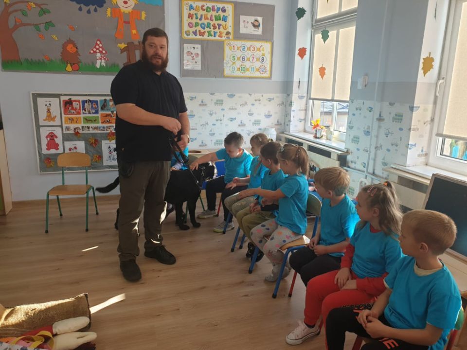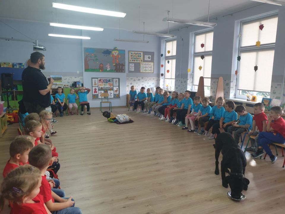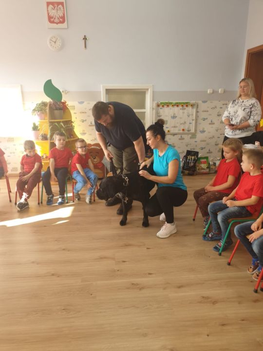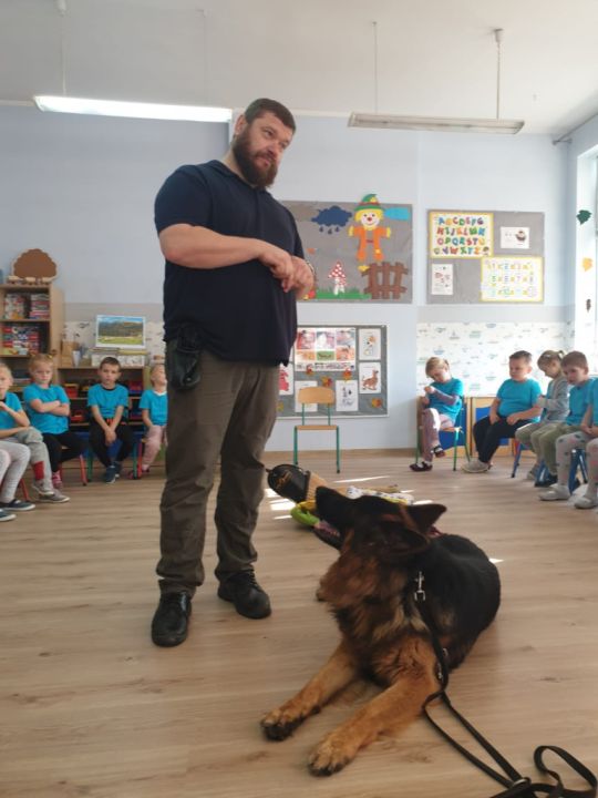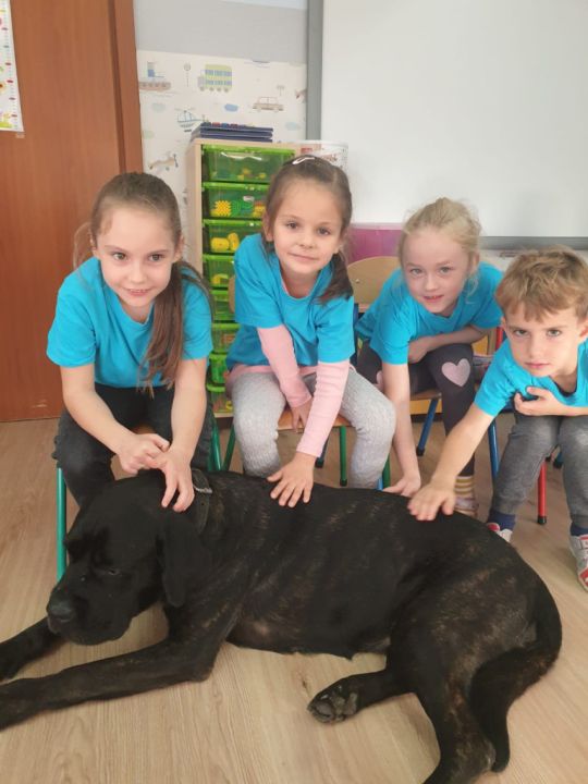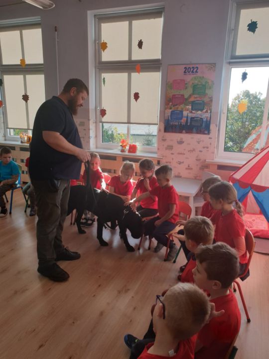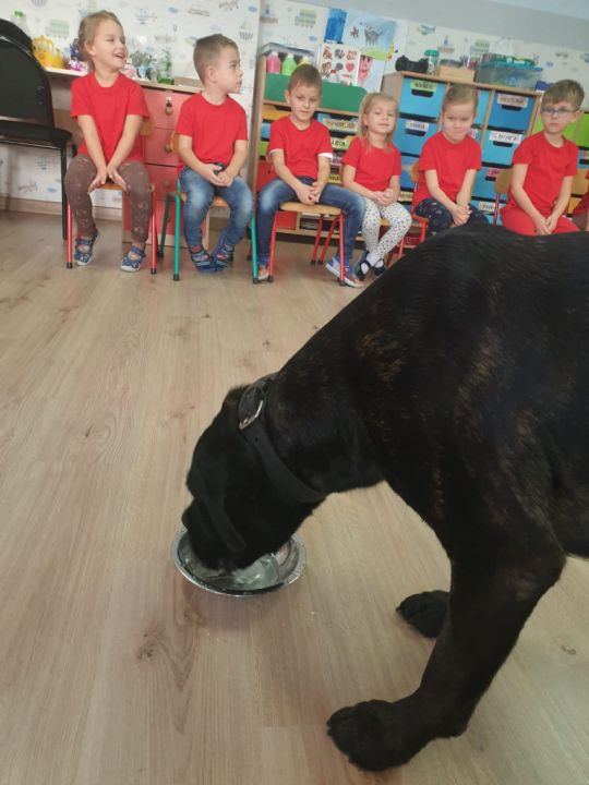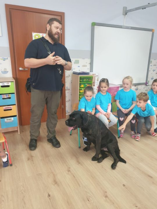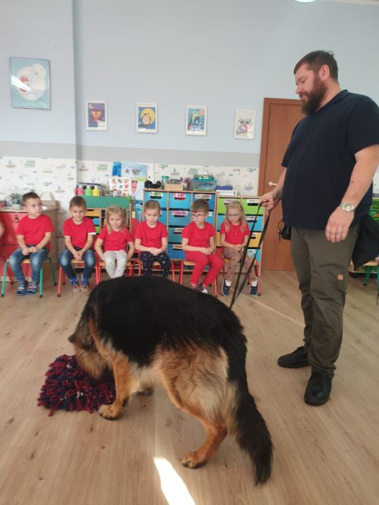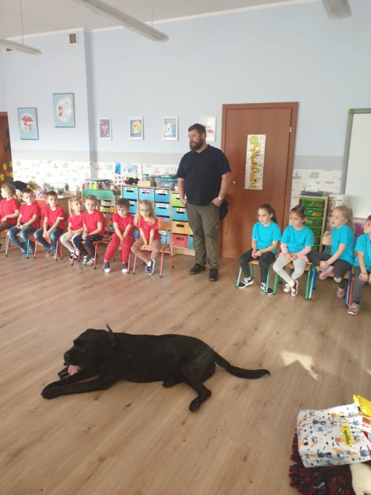 Natomiast grupy: „Muchomorki” i „Sówki” zaprosiły Pana Mateusza z „Akademii Pana Bobra” ze swoimi pupilami: Ritą – rasy Cane Corso Italiano oraz Tajkana – Owczarka Niemieckiego Długowłosego. Są to psy specjalnie szkolone, głównie do dogoterapii. Starszaki dowiedziały się wielu ciekawostek, między innymi jakie pozycję ciała przyjmować w razie ataku agresywnego psa, bo i takie też niestety się zdarzają. Pan Mateusz opowiadał jak szkolić psy i jak powinni zachowywać się odpowiedzialni właściciele. Pies, to niewątpliwie najlepszy przyjaciel człowieka, ale należy go dobrze wychować.