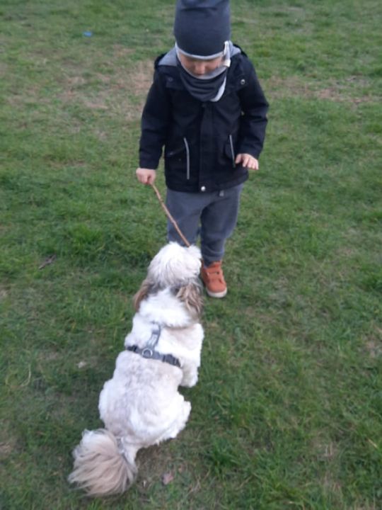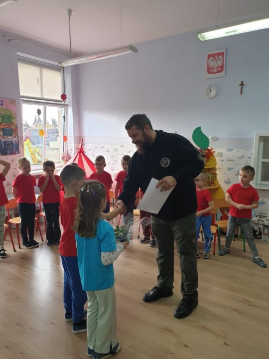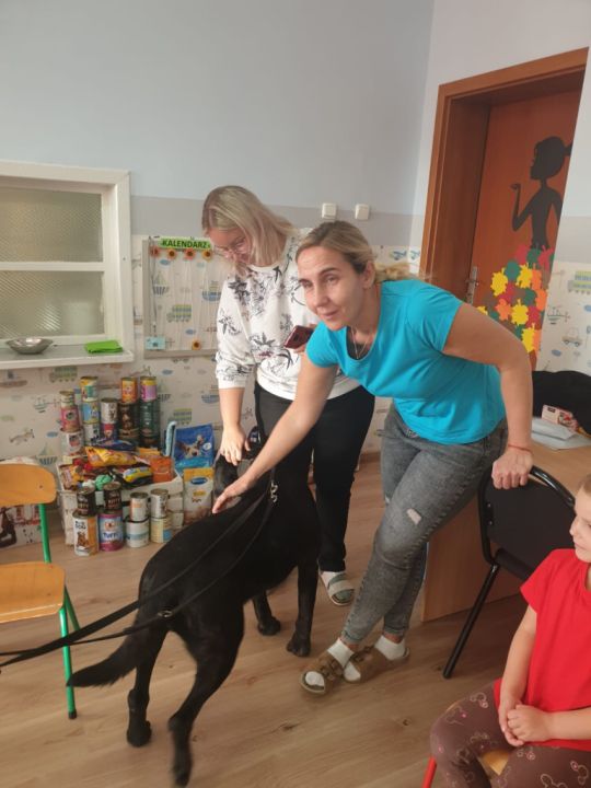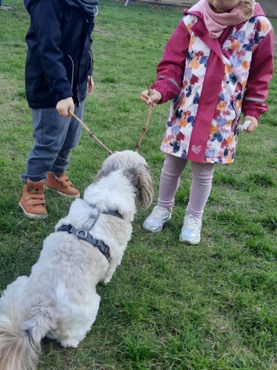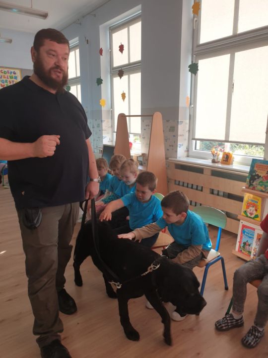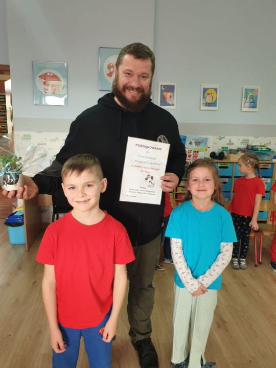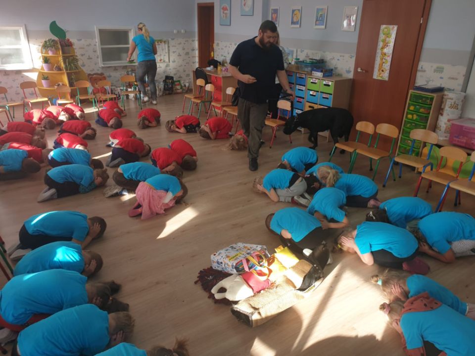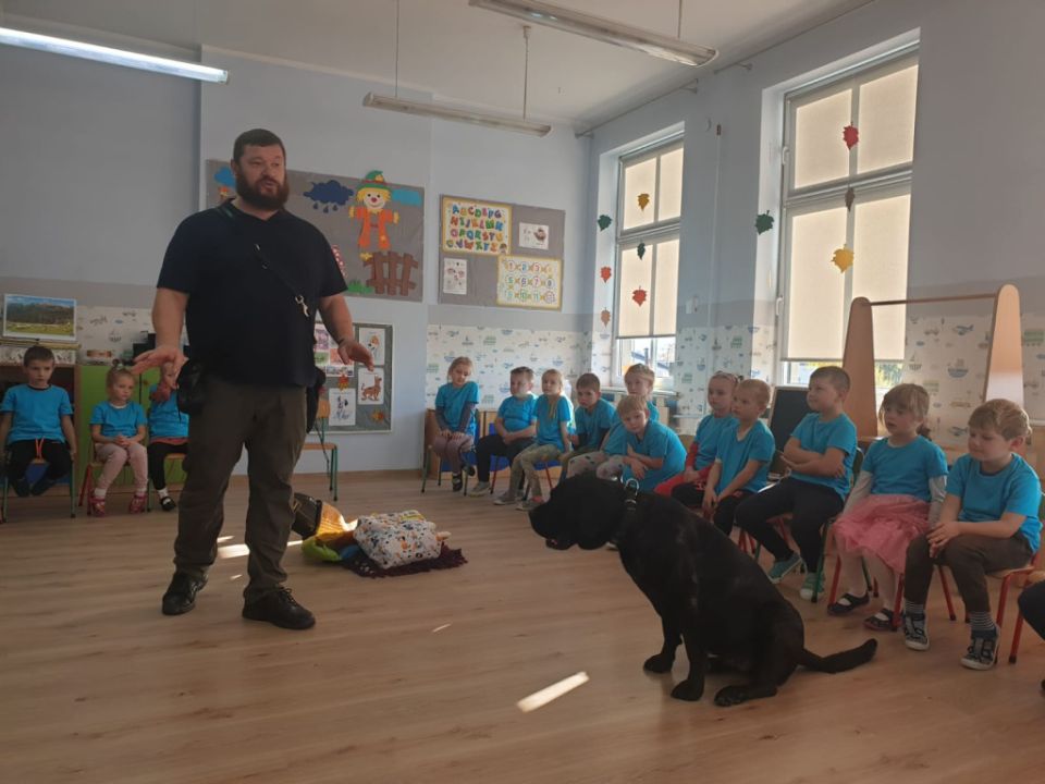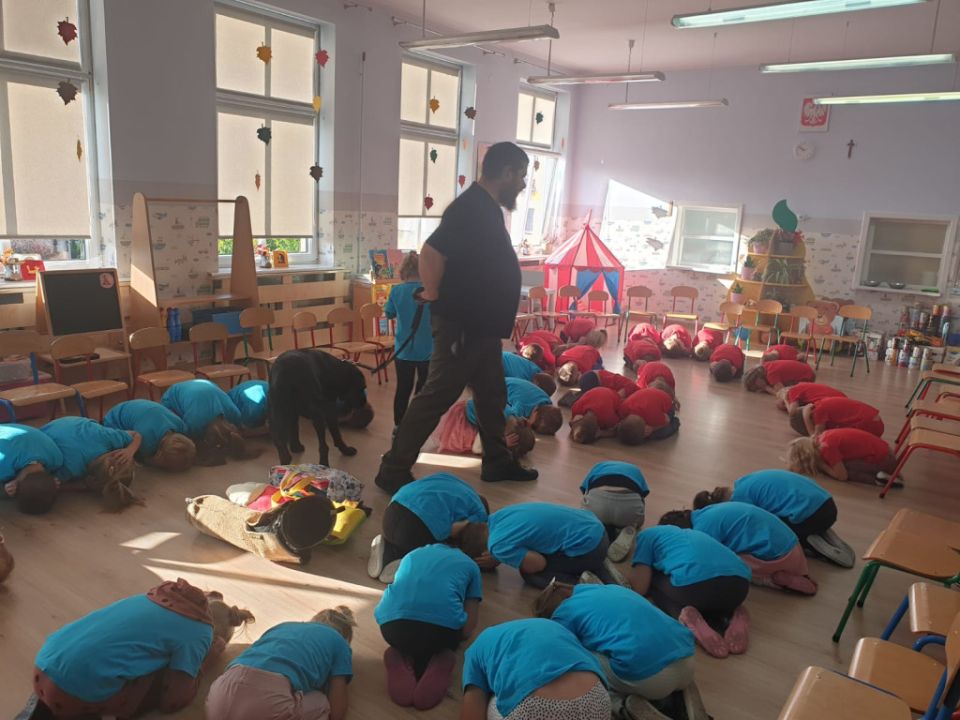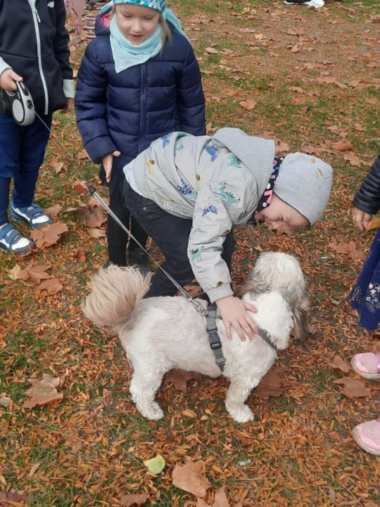 Natomiast grupy: „Muchomorki” i „Sówki” zaprosiły Pana Mateusza z „Akademii Pana Bobra” ze swoimi pupilami: Ritą – rasy Cane Corso Italiano oraz Tajkana – Owczarka Niemieckiego Długowłosego. Są to psy specjalnie szkolone, głównie do dogoterapii. Starszaki dowiedziały się wielu ciekawostek, między innymi jakie pozycję ciała przyjmować w razie ataku agresywnego psa, bo i takie też niestety się zdarzają. Pan Mateusz opowiadał jak szkolić psy i jak powinni zachowywać się odpowiedzialni właściciele. Pies, to niewątpliwie najlepszy przyjaciel człowieka, ale należy go dobrze wychować.