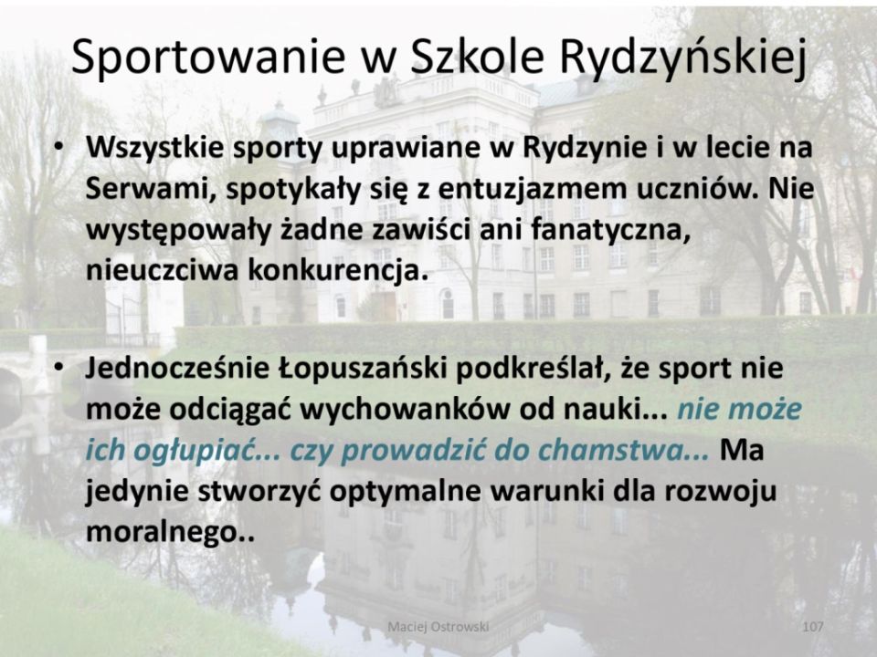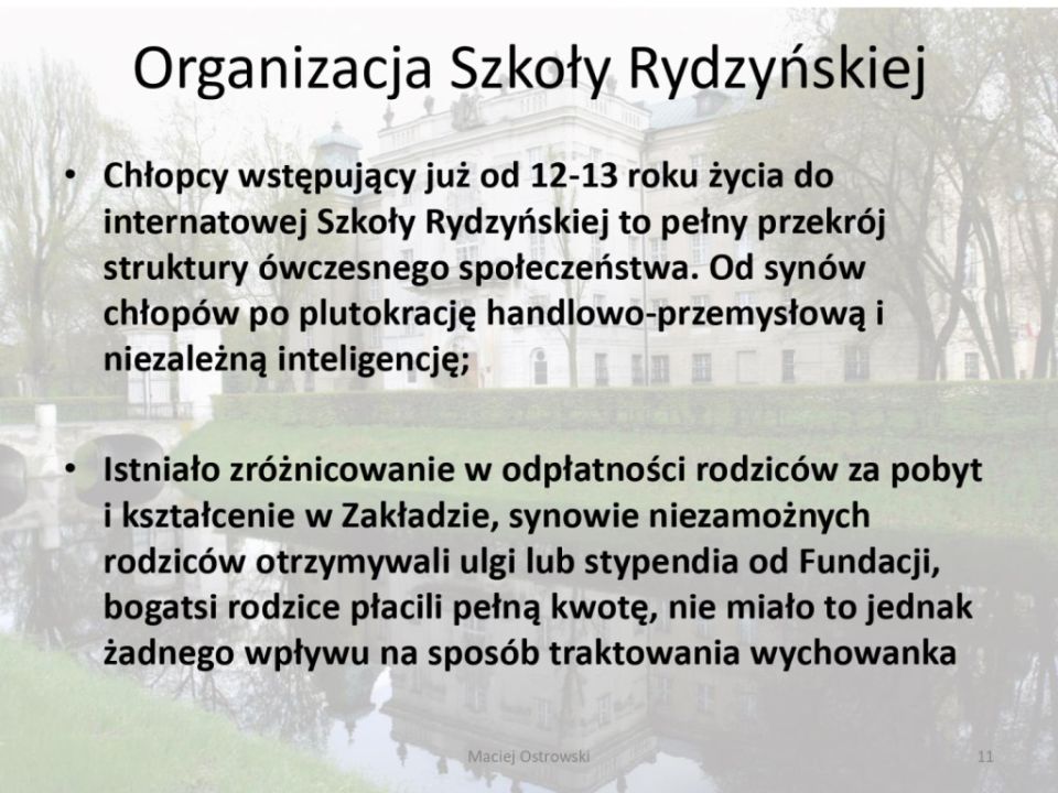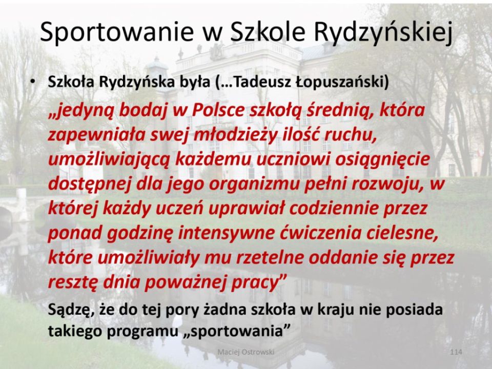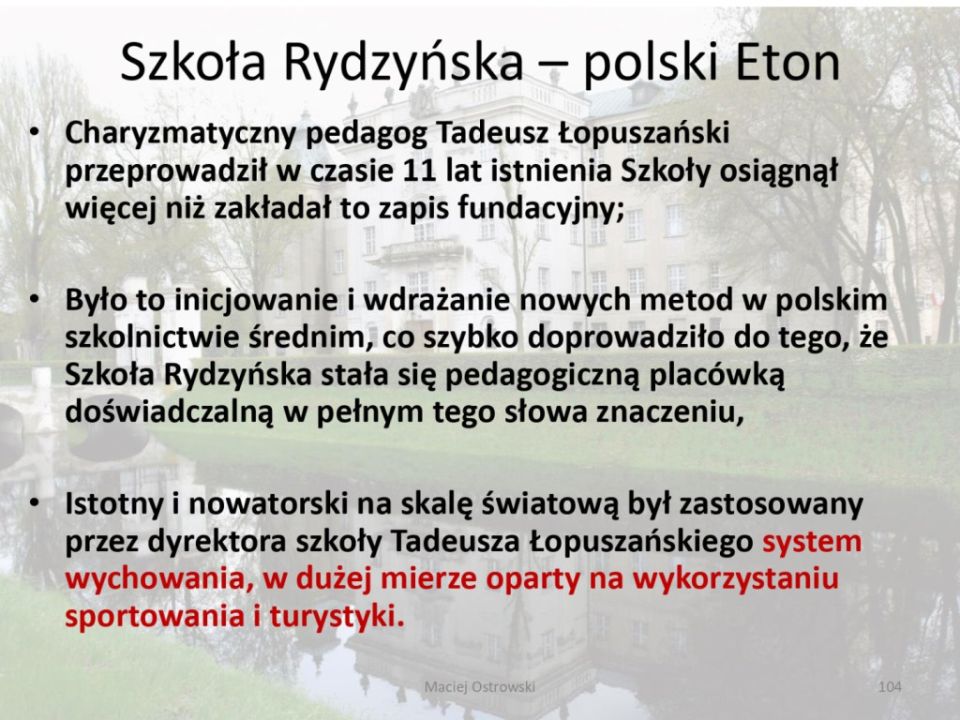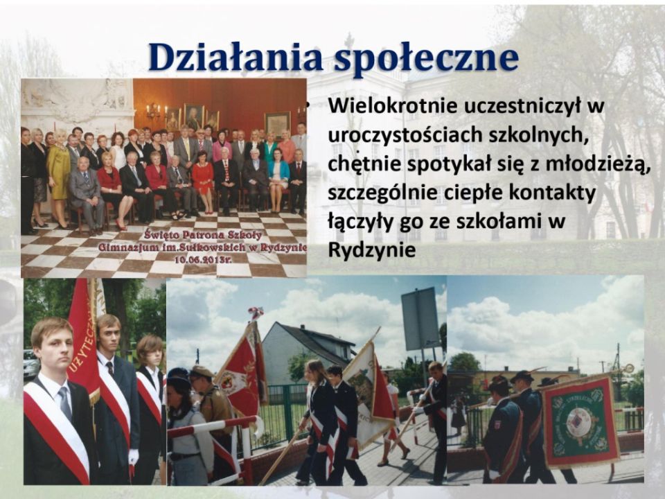 W dalszej części Burmistrz Miasta i Gminy Rydzyny Kornel Malcherek, Przewodniczący Rady Miejskiej w Rydzynie Roman Skiba, Starosta Powiatu Leszczyńskiego Jarosław Wawrzyniak i Dyrektor Biura Wojewody Wielkopolskiego w Lesznie Zenon Jóźwiak dokonali przecięcia wstęgi i otwarcia Sali Tradycji poświęconej Tadeuszowi Łopuszańskiemu i jego szkole. Na wystawie pokazano między innymi świadectwo szkolne, pomoce wykonane przez rydzyńskich uczniów, listy pisane przez Tadeusza Łopuszańskiego i nauczyciela Mariana Jasińskiego, książki opisujące działania rydzyńskiej szkoły jak i „Rydzyniaka” czasopismo redagowane przez uczniów. Jest też mnóstwo innych dokumentów i zdjęć ukazujących działania rydzyńskich uczniów i nauczycieli. Można tam też zobaczyć rzeczy współczesne z końca XX w. Jest to sztandar Rydzyńskiego Gimnazjum im. Sułkowskich nawiązującego do historii przedwojennej. Na koniec wszyscy zebrani uczestniczyli w prelekcji przedstawiającej życie Jana Bohdana Glińskiego oraz działalność rydzyńskiej szkoły.