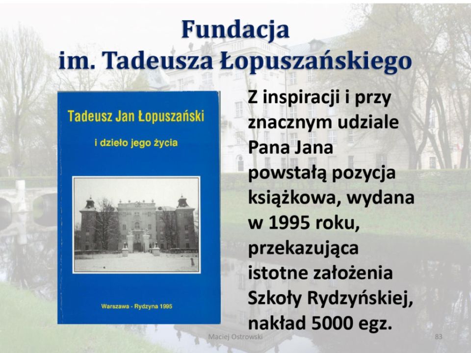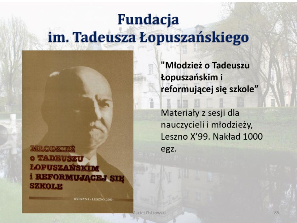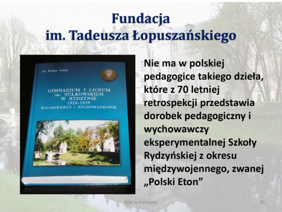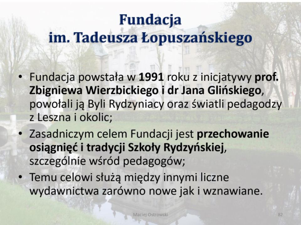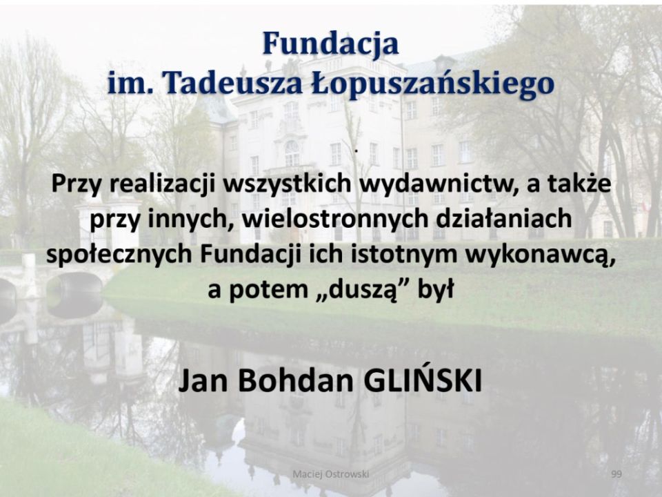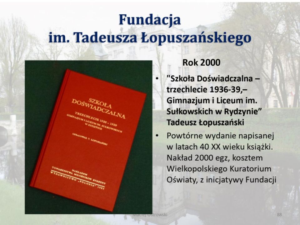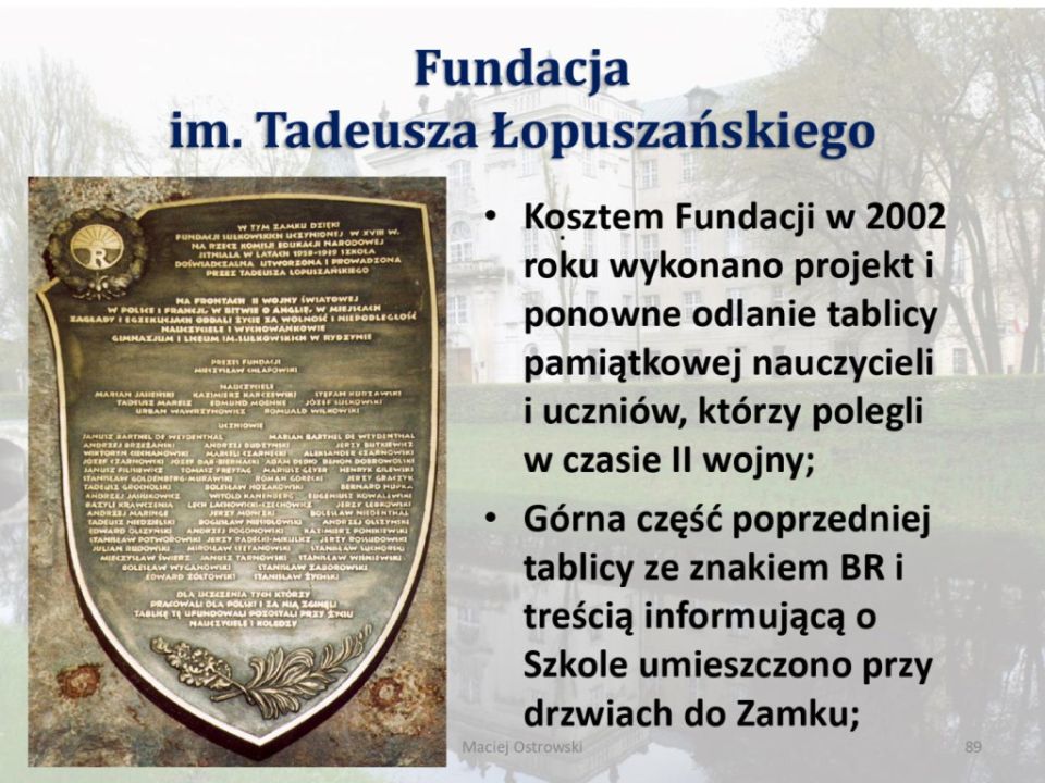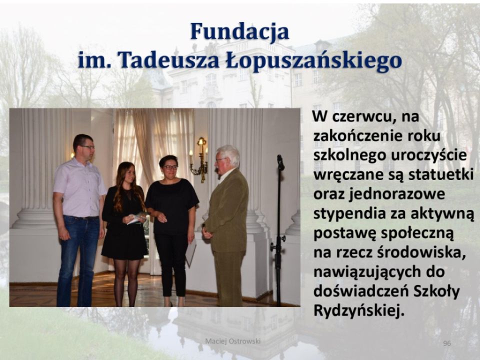 17.12.2022 r. członkowie Fundacji im. Tadeusza Łopuszańskiego wraz z zaproszonymi gośćmi, uczniami szkół z Dąbcza i Leszna oraz 10 Drużyny Harcerskiej z Dąbcza, których patronem jest Tadeusz Łopuszański uczestniczyli w podwójnej uroczystości zorganizowanej w Rydzyńskim Zamku. Maciej Ostrowski i Katarzyna Nowosad potomkowie Byłych Rydzyniaków czyli osób uczących się w działającym w zamku w okresie międzywojennym Gimnazjum/Liceum im. Sułkowskich dokonali odsłonięcia tablicy pamiątkowej poświęconej dr Janowi Bohdanowi Glińskiemu. Pan Jan był absolwentem rydzyńskiej szkoły, w roku 1934 zdał maturę. Był współzałożycielem i wieloletnim dyrektorem Zarządu Rady Fundacji im. Tadeusza Łopuszańskiego. W 2015 r. otrzymał Odznakę Zasłużony dla Miasta i Gminy Rydzyna.