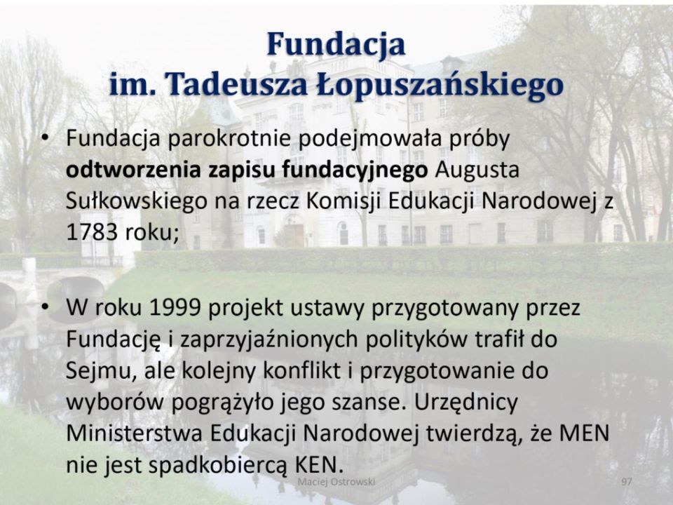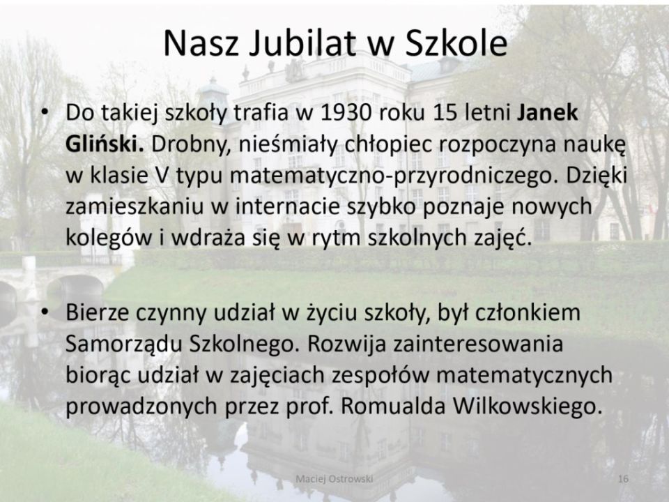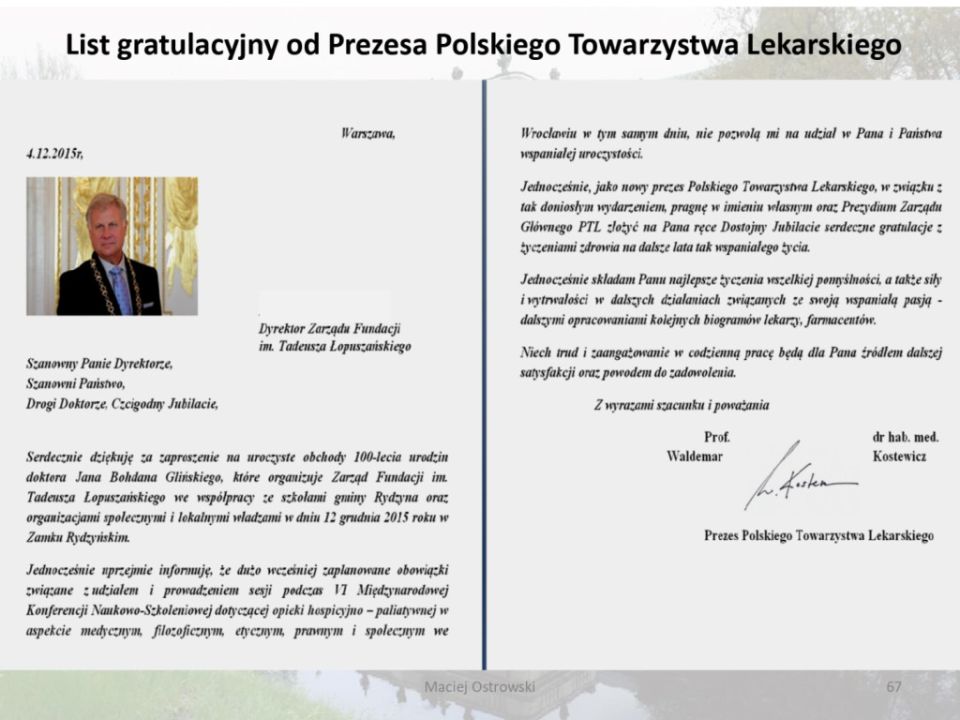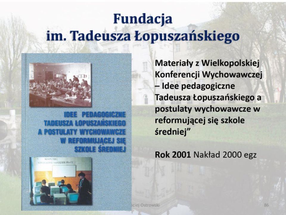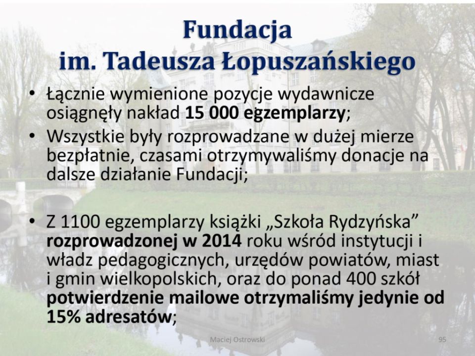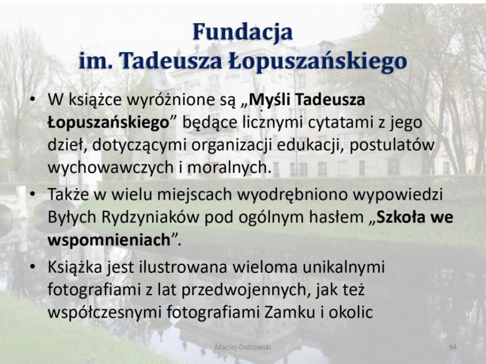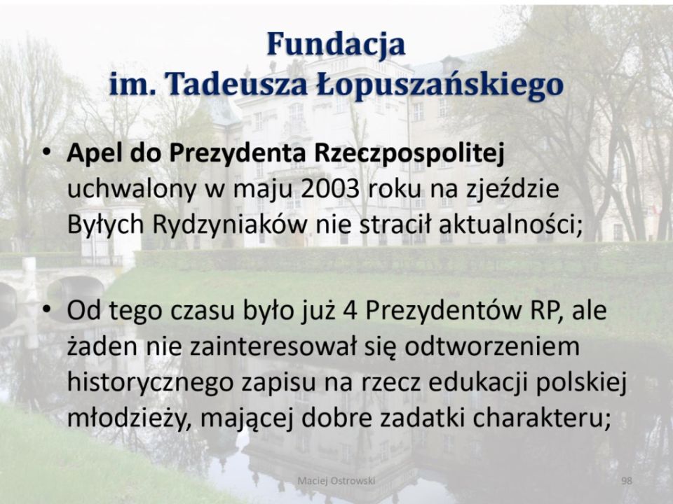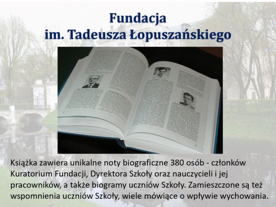 17.12.2022 r. członkowie Fundacji im. Tadeusza Łopuszańskiego wraz z zaproszonymi gośćmi, uczniami szkół z Dąbcza i Leszna oraz 10 Drużyny Harcerskiej z Dąbcza, których patronem jest Tadeusz Łopuszański uczestniczyli w podwójnej uroczystości zorganizowanej w Rydzyńskim Zamku. Maciej Ostrowski i Katarzyna Nowosad potomkowie Byłych Rydzyniaków czyli osób uczących się w działającym w zamku w okresie międzywojennym Gimnazjum/Liceum im. Sułkowskich dokonali odsłonięcia tablicy pamiątkowej poświęconej dr Janowi Bohdanowi Glińskiemu. Pan Jan był absolwentem rydzyńskiej szkoły, w roku 1934 zdał maturę. Był współzałożycielem i wieloletnim dyrektorem Zarządu Rady Fundacji im. Tadeusza Łopuszańskiego. W 2015 r. otrzymał Odznakę Zasłużony dla Miasta i Gminy Rydzyna.