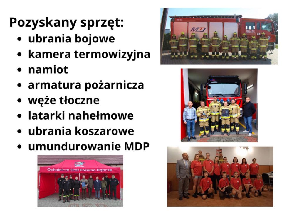 2022 rok dobry również był pod względem kupna wyposażenia. Udało zrealizować się w znacznej części wymianę ubrań bojowych typu Nomex, zakupili również kamerę termowizyjną, umundurowanie dla MDP jak i armaturę pożarniczą. Wszystkie te rzeczy nie znalazłyby się u strażaków ochotników gdyby nie rządowe wsparcie, przychylność włodarzy oraz hojność wielu sponsorów.