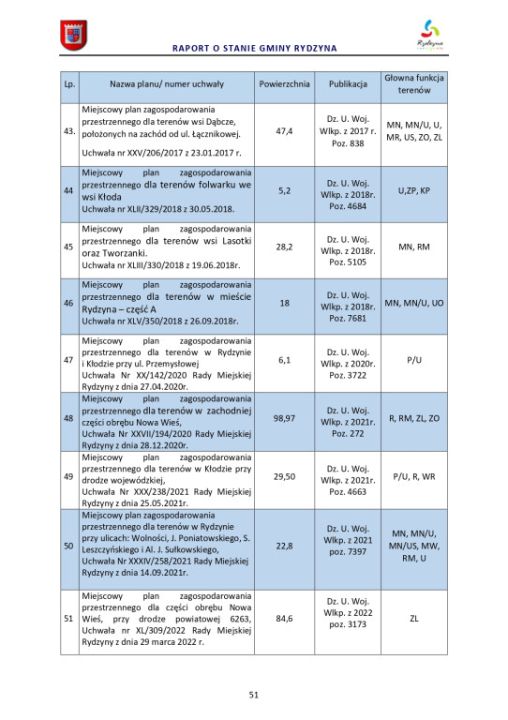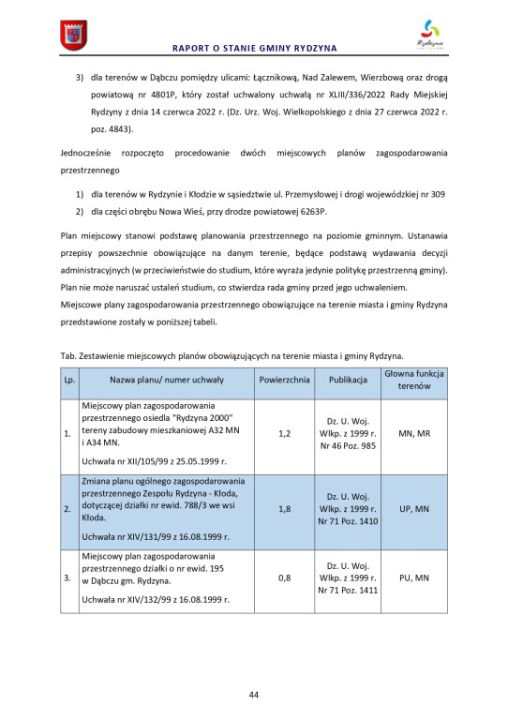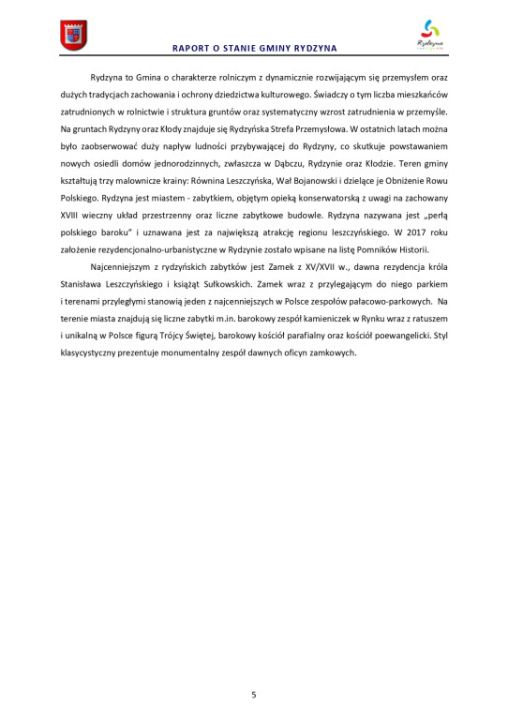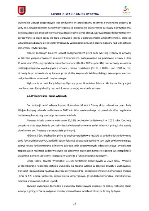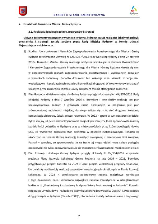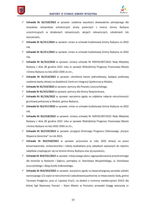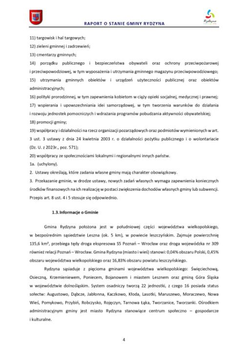 Zgodnie z art. 28 aa ustawy z dnia 8 marca 1990 r. o samorządzie gminnym (Dz. U. z 2022 r. poz. 559 ze zm.) Burmistrz Miasta i Gminy Rydzyna przedstawia Radzie Miejskiej Rydzyny raport o stanie Gminy Rydzyna za rok 2022.