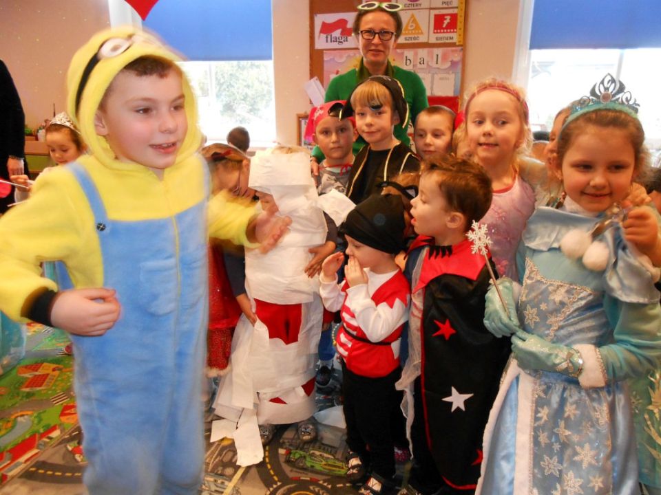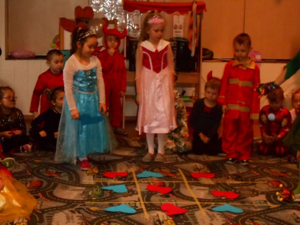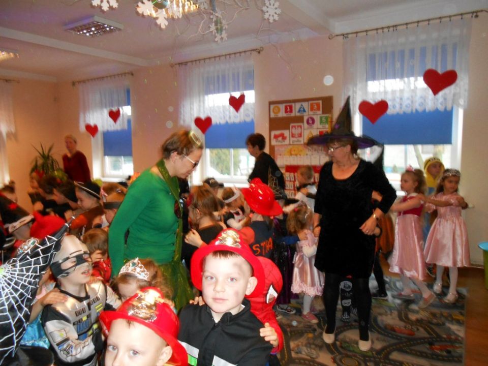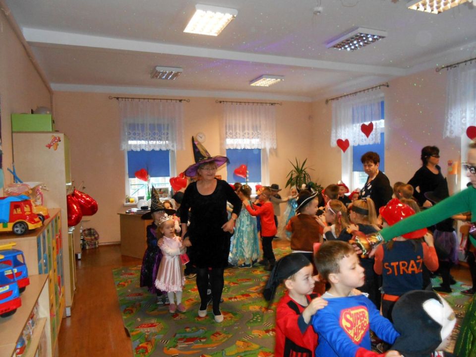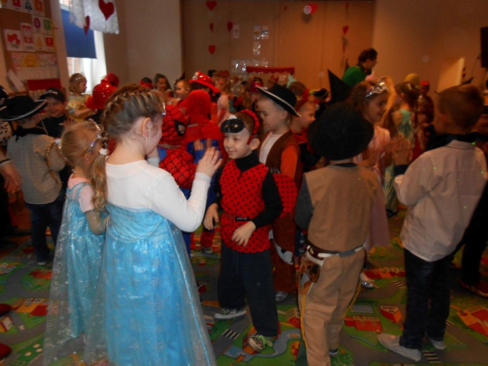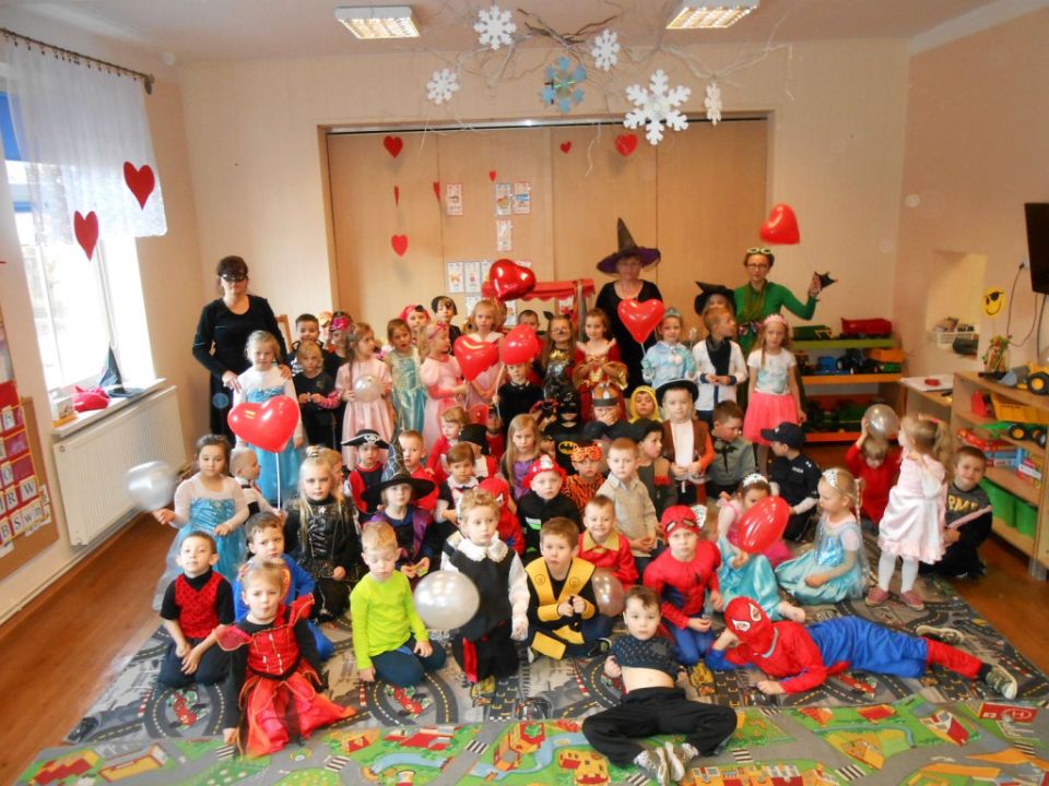 Na parkiecie pojawiły się księżniczki, piraci, wróżki, czarownice, rycerze, Spider – Man, Batman oraz różne zwierzątka, a zwłaszcza koty, tygrysy, bo 17II to Międzynarodowy Dzień Kota ,a także inni bohaterowie baśni, bajeczek i wierszyków . Dzieci przywitała p. dyrektor, która życzyła wszystkim wesołej zabawy. Przedszkolaki bawiły się przy znanych im piosenkach oraz zabawach muzyczno-ruchowych. Nie zabrakło również tradycyjnych kaczuszek oraz pociągu.
