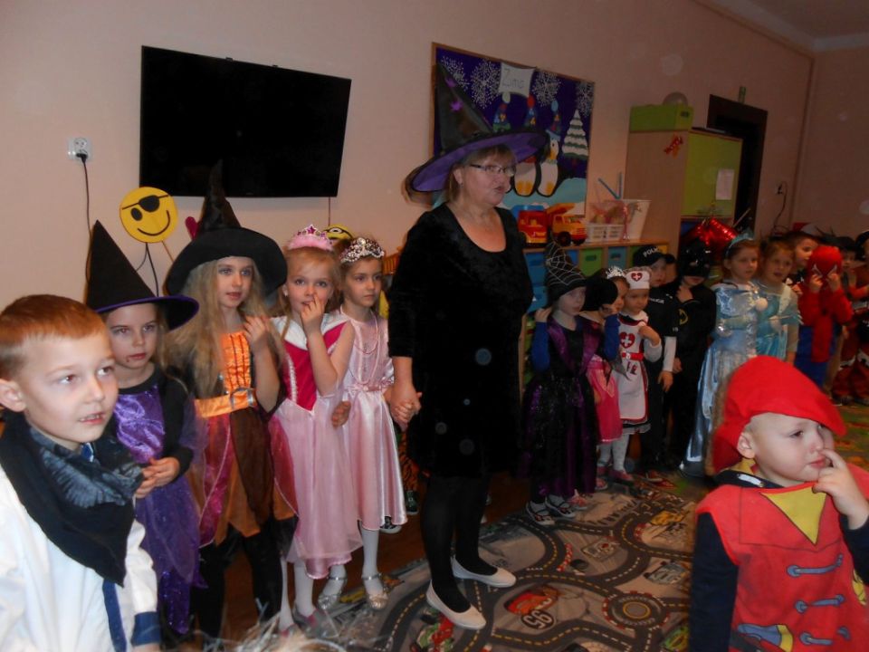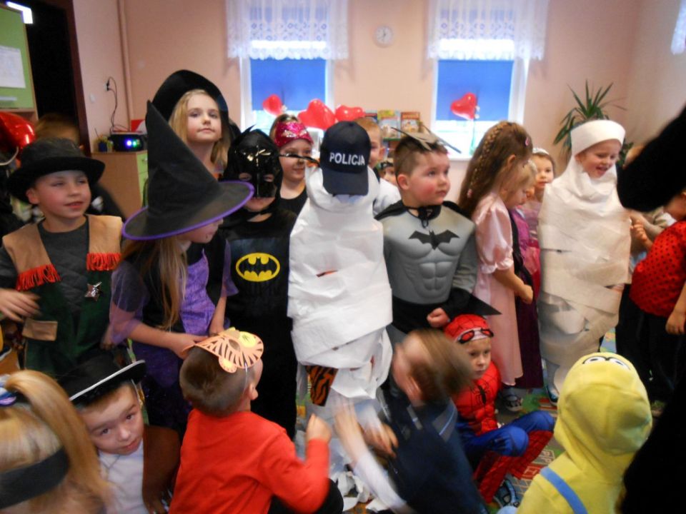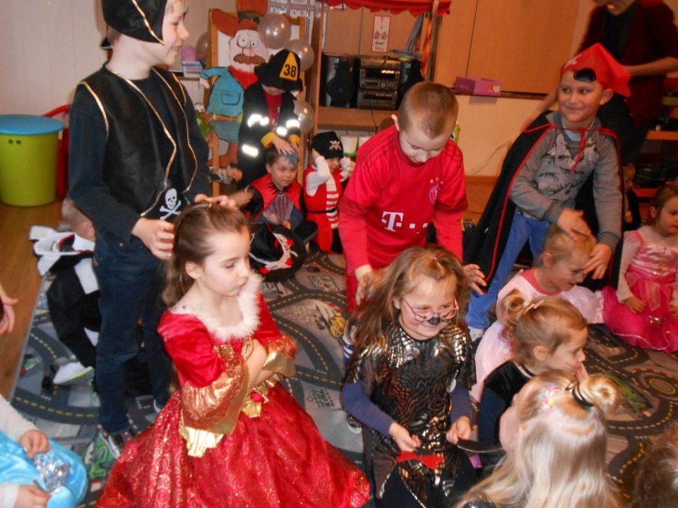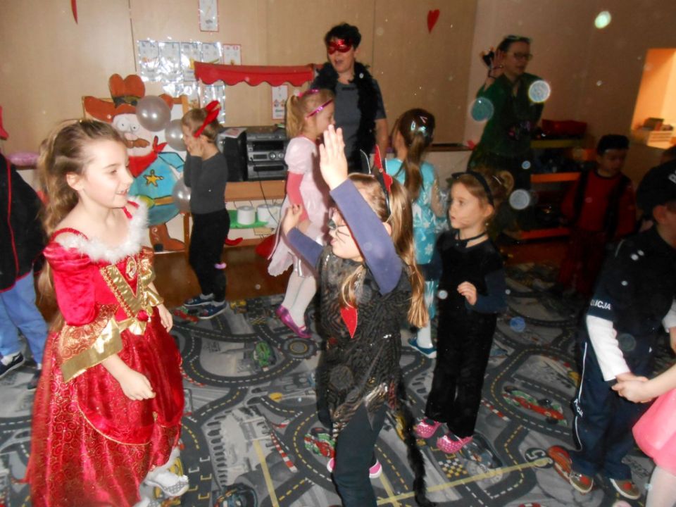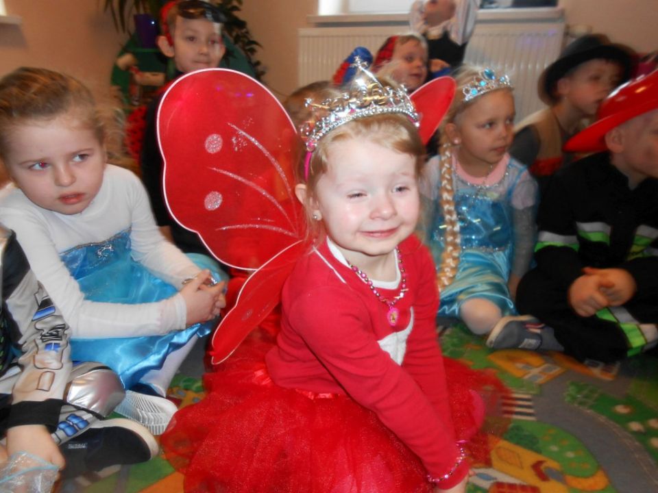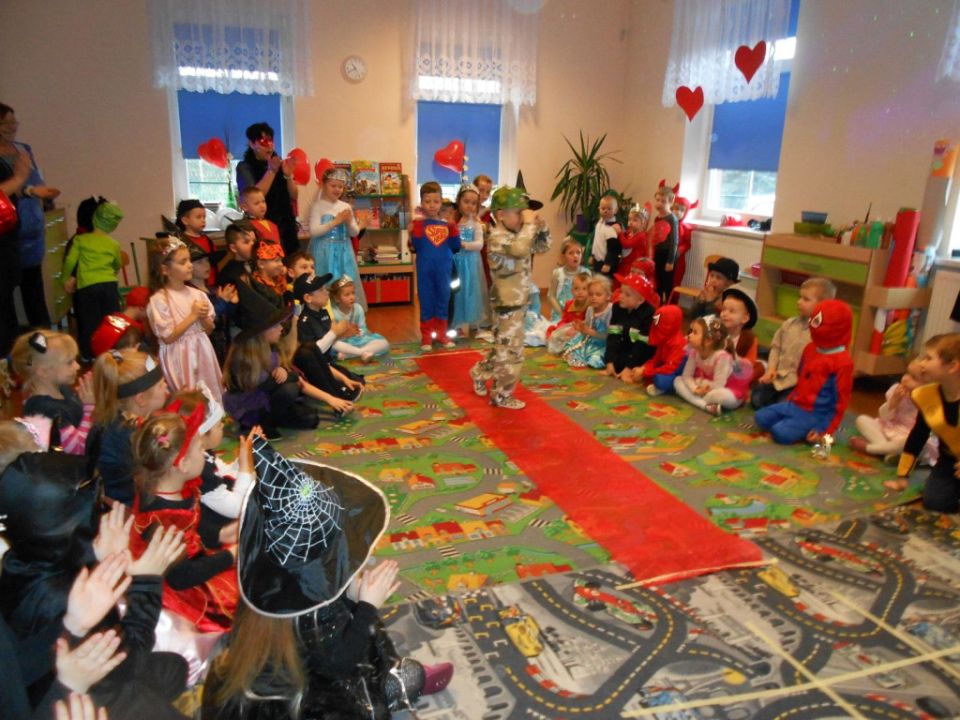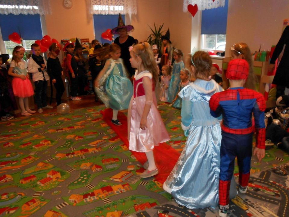 Na parkiecie pojawiły się księżniczki, piraci, wróżki, czarownice, rycerze, Spider – Man, Batman oraz różne zwierzątka, a zwłaszcza koty, tygrysy, bo 17II to Międzynarodowy Dzień Kota ,a także inni bohaterowie baśni, bajeczek i wierszyków . Dzieci przywitała p. dyrektor, która życzyła wszystkim wesołej zabawy. Przedszkolaki bawiły się przy znanych im piosenkach oraz zabawach muzyczno-ruchowych. Nie zabrakło również tradycyjnych kaczuszek oraz pociągu.