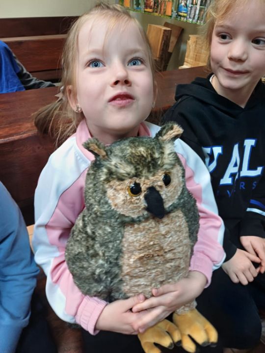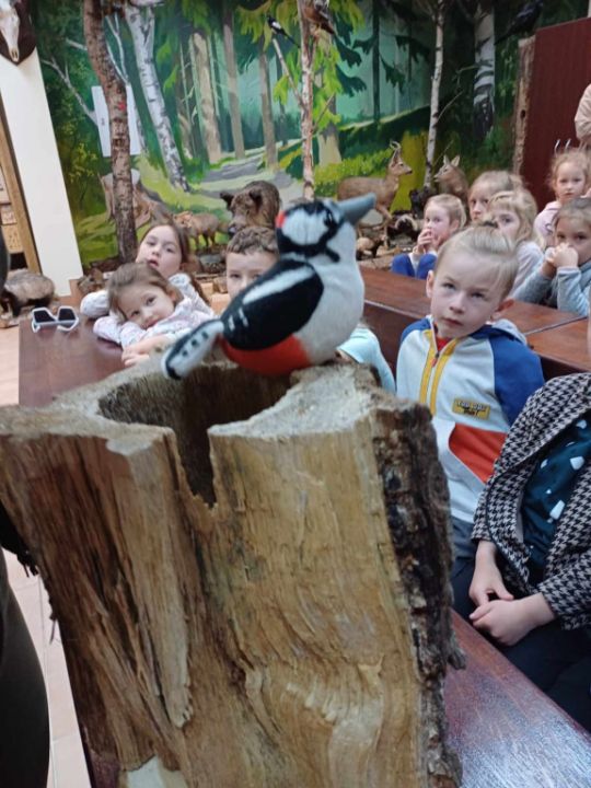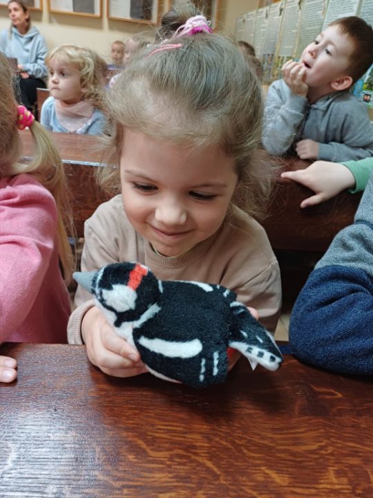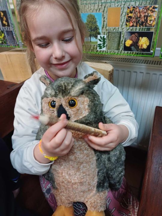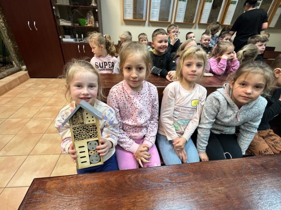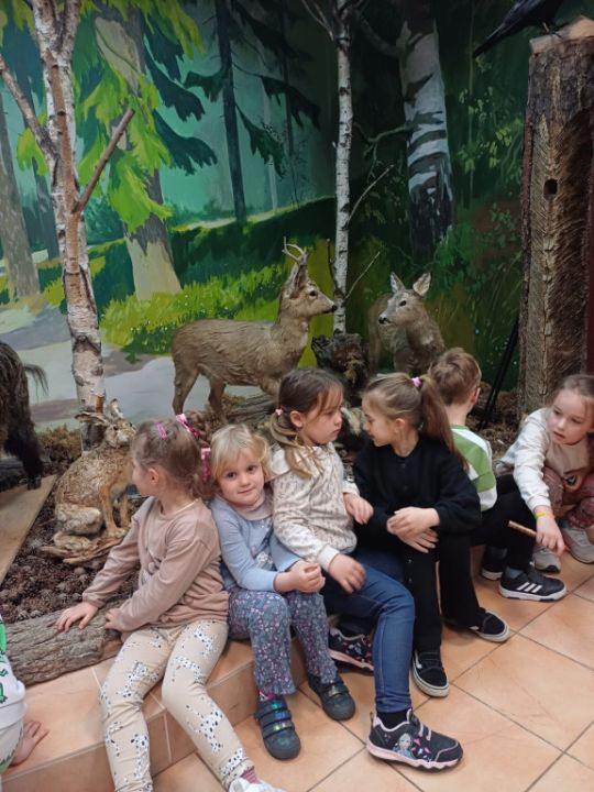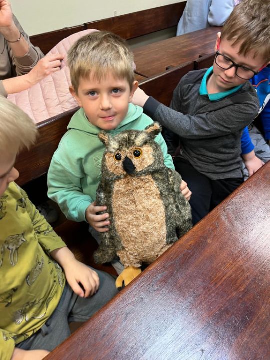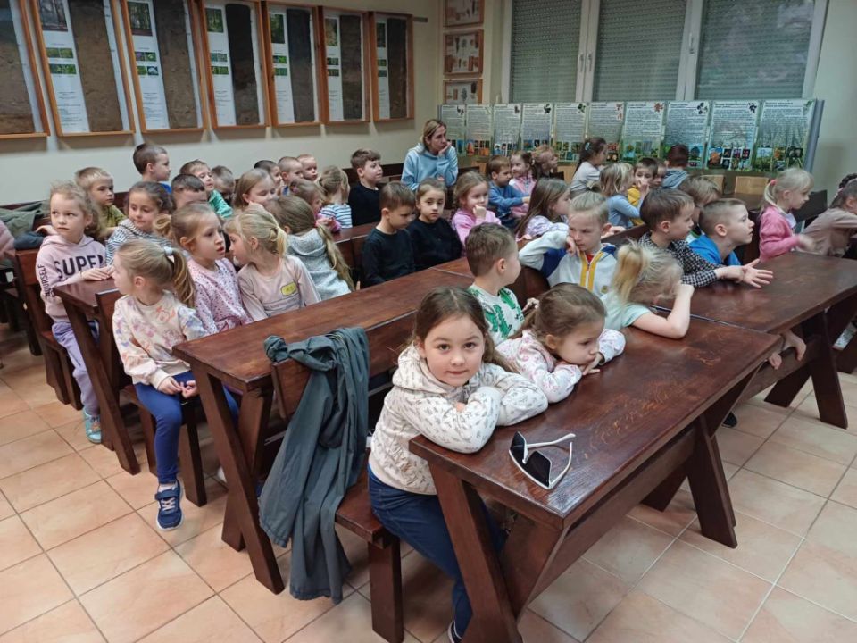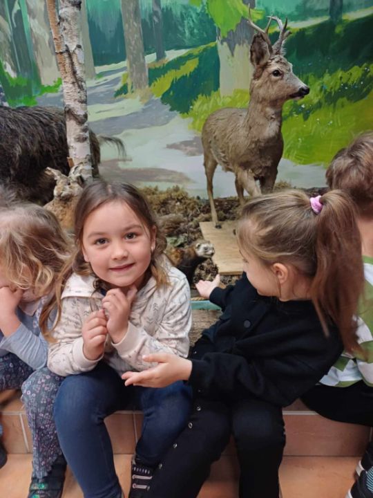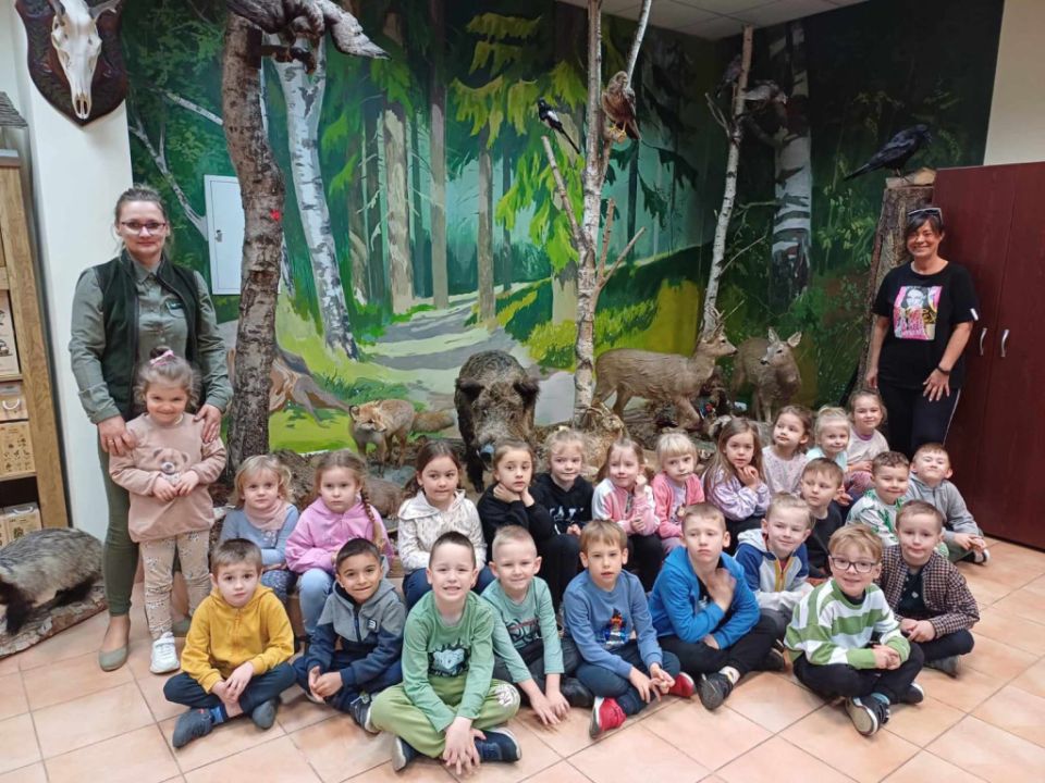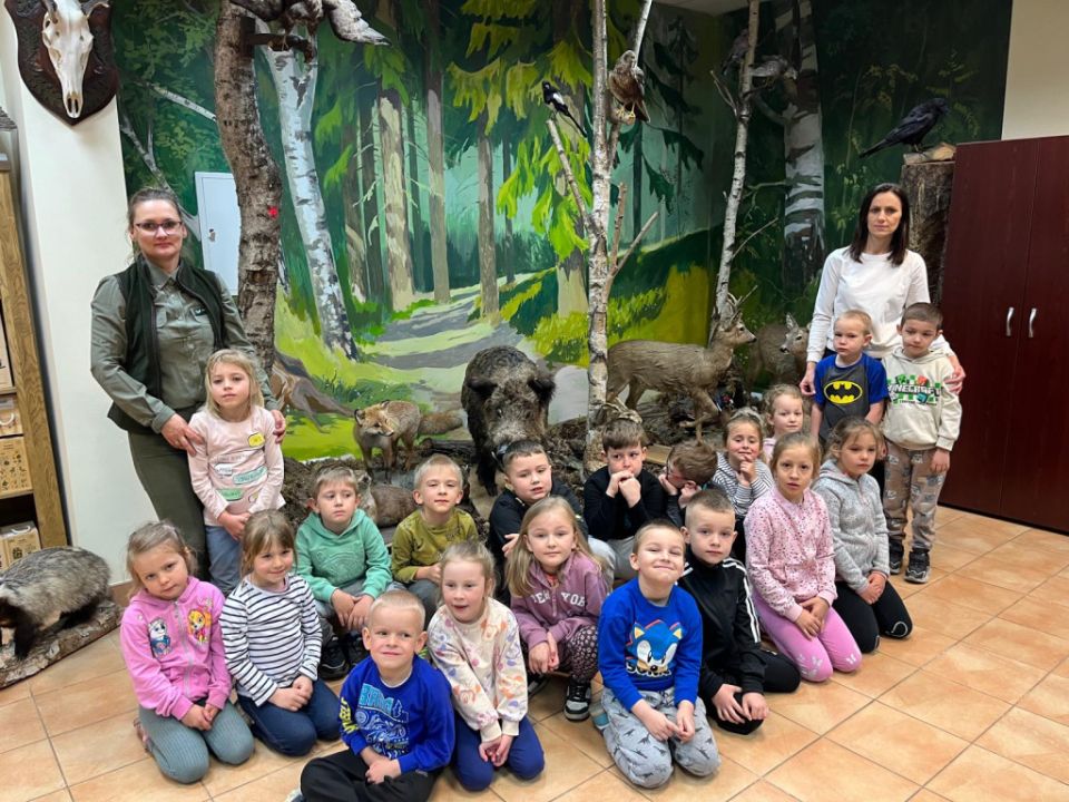 Przedszkolacy z Kolorowego Wiatraczka z grup Sowy i Pszczółki odwiedziły Nadleśnictwo Karczma Borowa w Lesznie. Pani Joanna Gintler – specjalista służby leśnej realizująca zadania z zakresu ochrony przyrody i odpowiedzialna za edukację, zaprosiła dzieci do salki  multimedialnej, w której odbyły się zajęcia przyrodnicze oraz pokaz filmiku.  Dzieci odpowiadały na pytania, rozwiązywały zagadki słuchowe, dowiedziały się czego nie wolno w lesie robić oraz jak leśnicy pomagają zwierzynie przetrwać zimę. Przedszkolacy brali udział w konkursach wiedzy o leśnych zwierzętach, a kto dobrze odpowiedział otrzymywał nagrodę. Pytania do łatwych nie należały, ale dzieci były aktywne i posiadały dużą wiedzę przyrodniczą.  W salce edukacyjnej  mogły też  zobaczyć wiele okazów zwierząt i roślin występujących w naszych lasach, utrwaliły  przy tym nazwy oraz  dowiedziały się również wielu nowych rzeczy, np., że nie tylko pies szczeka ale także sarna, kiedy się boi.