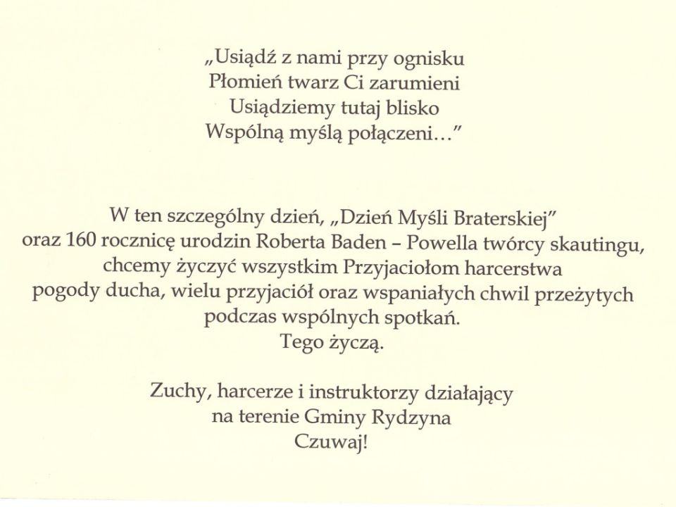 „Dzień myśli braterskiej” Wiadomości 2017-02-23 22 lutego przypada Dzień myśli braterskiej. Jest to święto przyjaźni, obchodzone przez harcerzy i skautów. Z tej okazji zuchy, harcerze oraz instruktorzy przekazali kartkę z życzeniami.