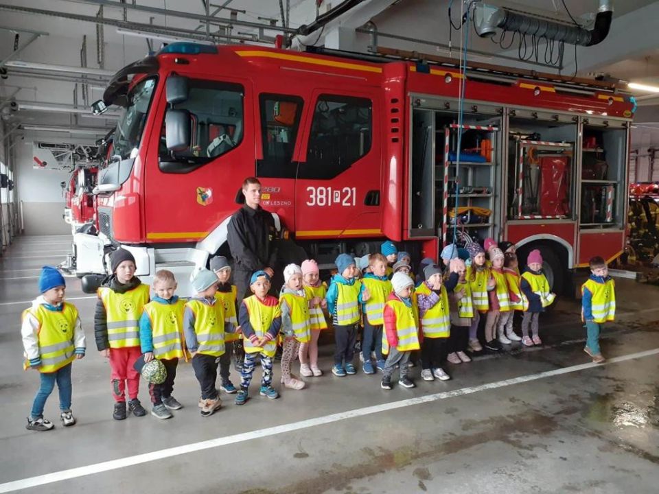 „Wróbelki” i „Kotki” z Przedszkola Kolorowy Wiatraczek w Rydzynie odwiedziły Komendę Miejską Państwowej Straży Pożarnej w Lesznie.