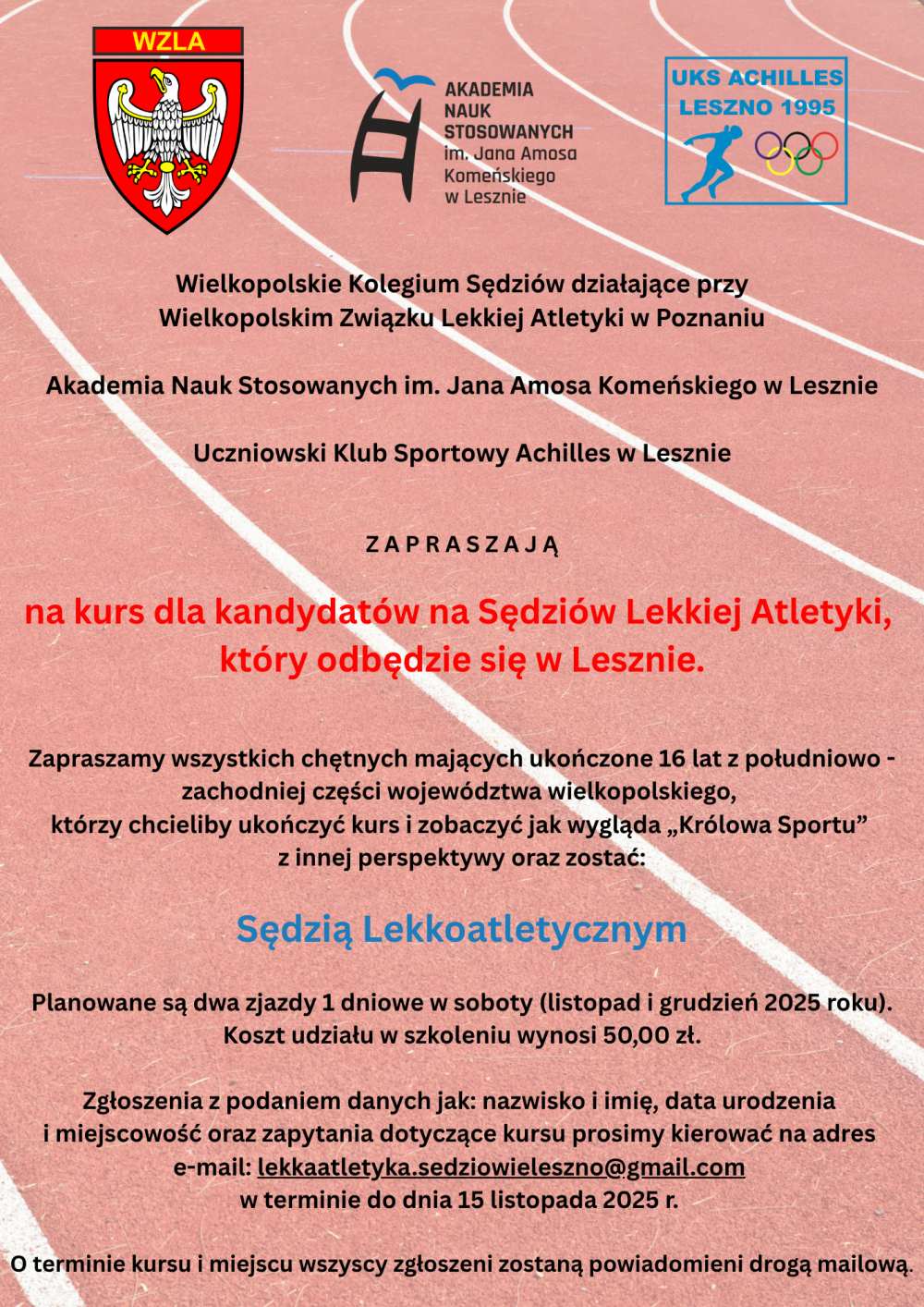 Wielkopolskie Kolegium Sędziów działające przy Wielkopolskim Związku Lekkiej Atletyki w Poznaniu, Akademia Nauk Stosowanych im. Jana Amosa Komeńskiego w Lesznie oraz Uczniowski Klub Sportowy Achilles Leszno zapraszają na kurs dla kandydatów na sędziów lekkiej atletyki.