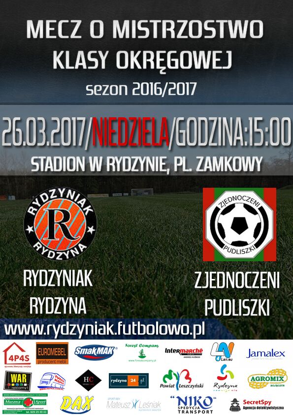 WSZYSCY NA RYDZYNIAKA! Sport 2017-03-25 Już w najbliższą niedzielę Rydzyniak Rydzyna zagra u siebie. Tym razem podejmą drużynę z Pudliszek. Więcej informacji na plakacie: