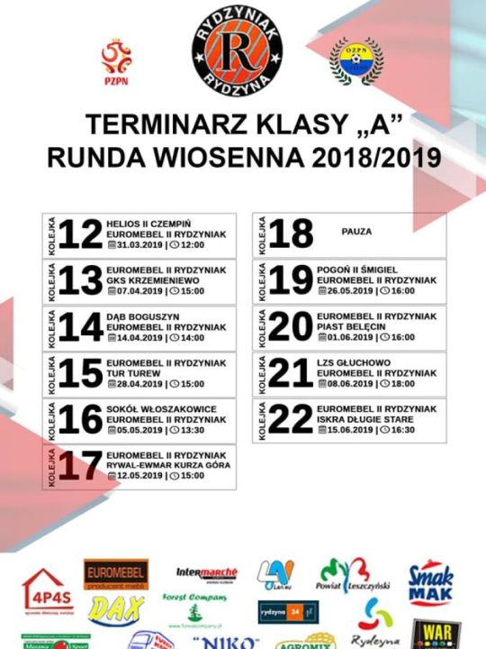 Wiemy już, jaki będzie terminasz rundy wiosennej. Szykujcie gardła i wspólnie z  nami wybierzcie się wspierać rydzyńską drużynę. Najbliższe spotkania już w sobotę, 16.03. w Wilkowicach. Druga drużyna rozpoczyna rywalizację 31.03.