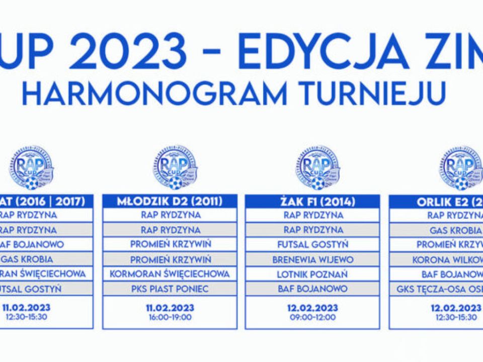 Piłkarski weekend 11-12.02.2023 w godzinach 09-19:00. Zapraszamy do rydzyńskiej hali sportowej, gdzie codziennie przez blisko 10h toczyć się będzie rywalizacja w kilku kategoriach wiekowych. Na parkiecie przez cały weekend swoje piłkarskie umiejętności pokaże blisko 360 małych piłkarzy.