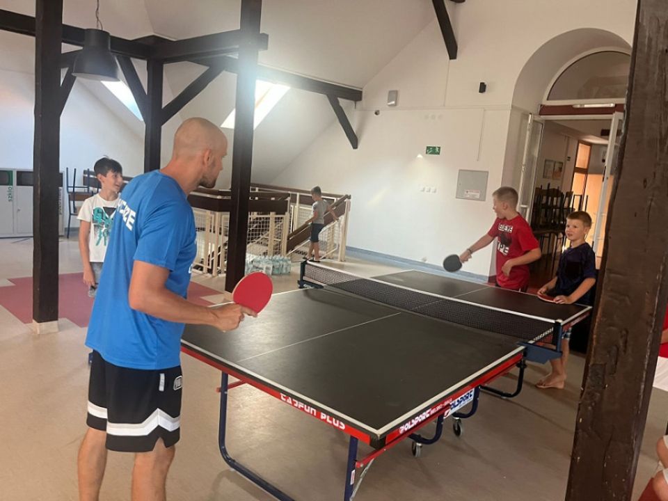 Po intensywnych ćwiczeniach przyszedł czas na relaks na basenie, gdzie uczestnicy mogli ochłonąć i zregenerować siły. Ku zaskoczeniu wszystkich, trener Robert zaprezentował swoje umiejętności w tenisie stołowym, pokazując, że gdyby nie koszykówka, miałby szansę na olimpijski medal w tej dyscyplinie.