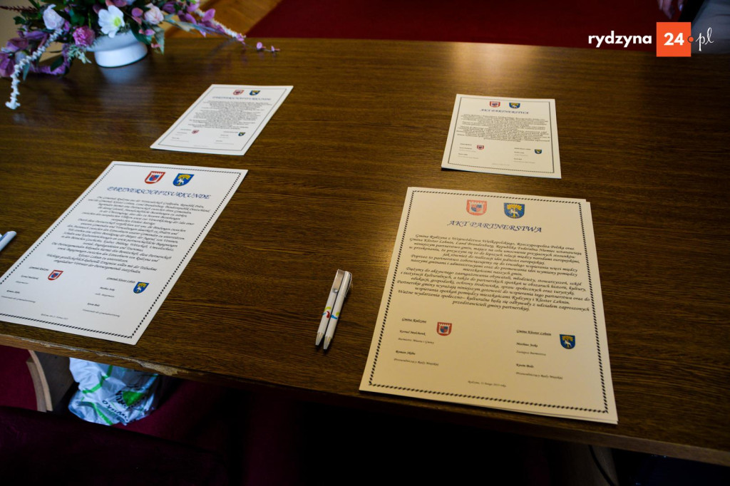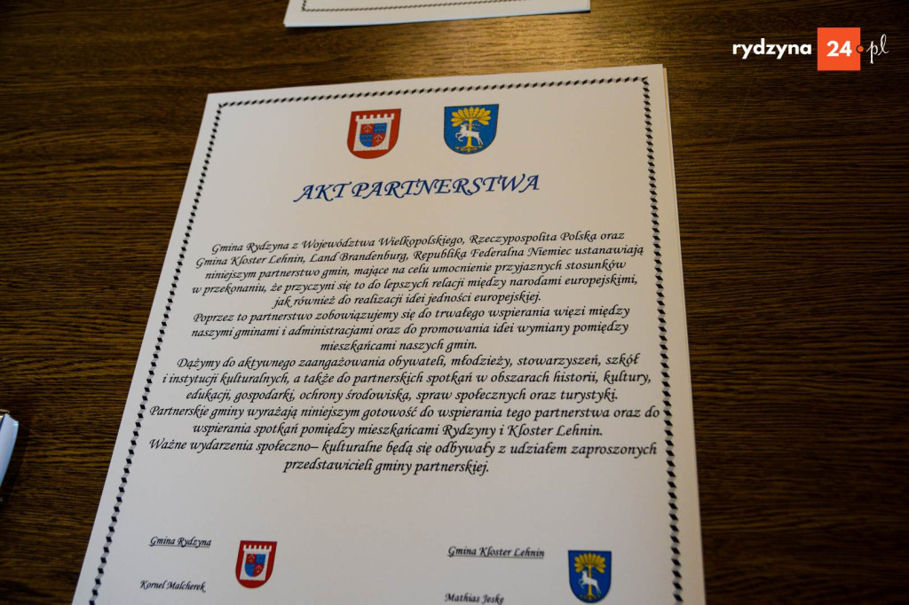 Dziś w gminie Rydzyna odbyło się uroczyste podpisanie aktu partnerstwa pomiędzy gminą Rydzyna a gminą Kloster Lehnin z Landu Brandenburgia w Niemczech. Celem partnerstwa jest zacieśnienie przyjaznych relacji, wspieranie współpracy oraz wymiana doświadczeń między mieszkańcami obu gmin.