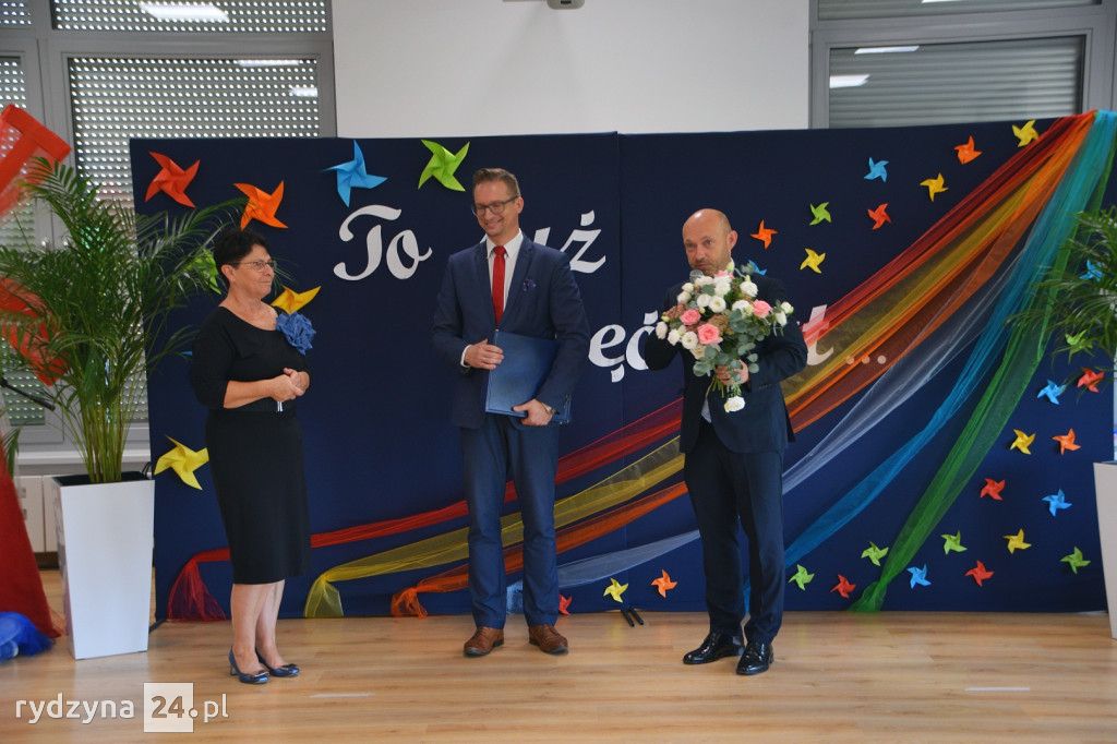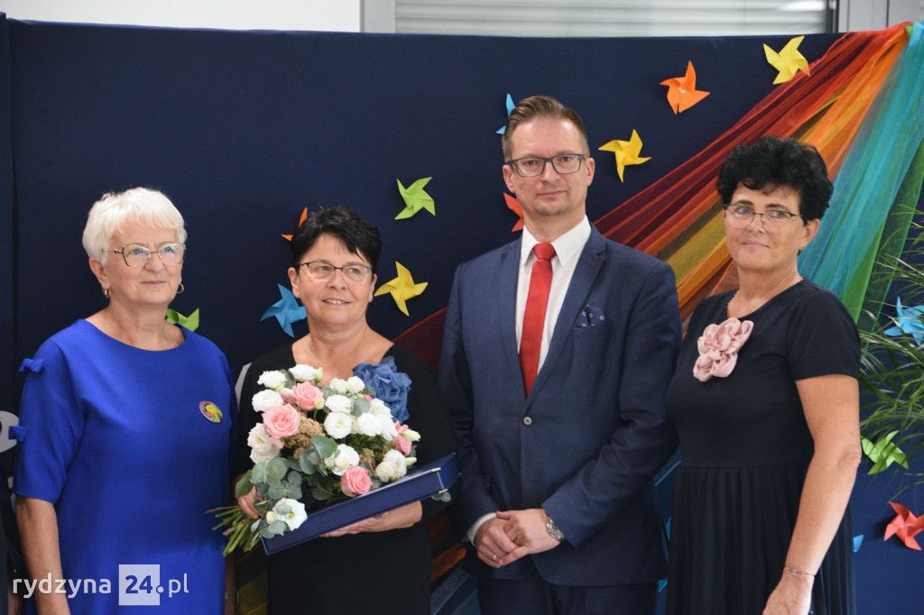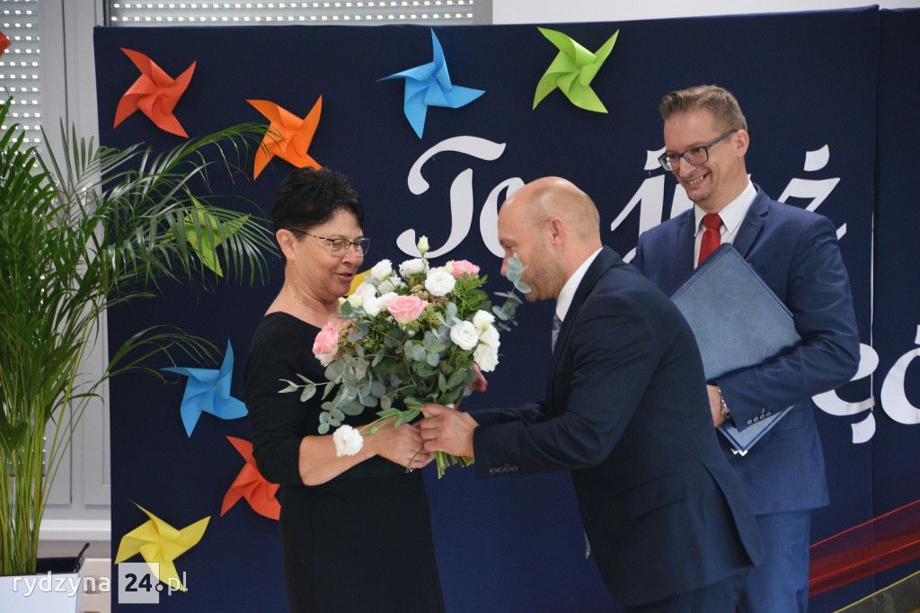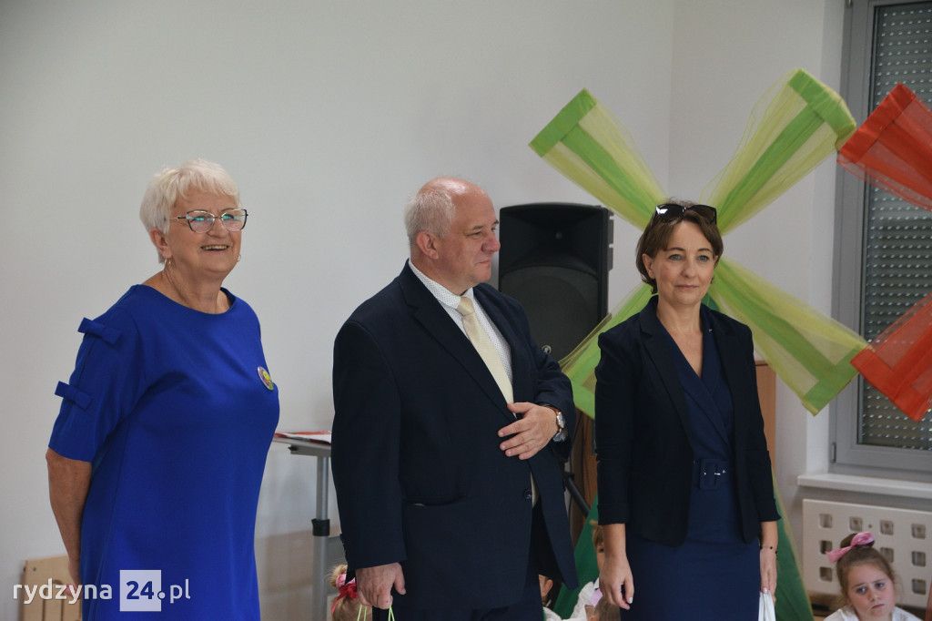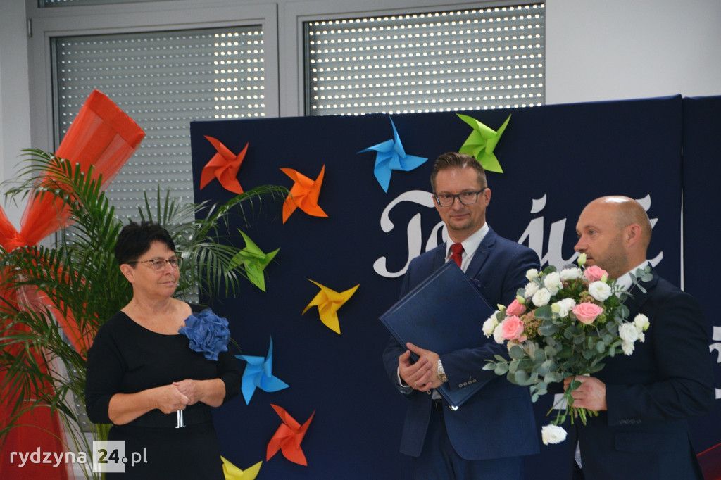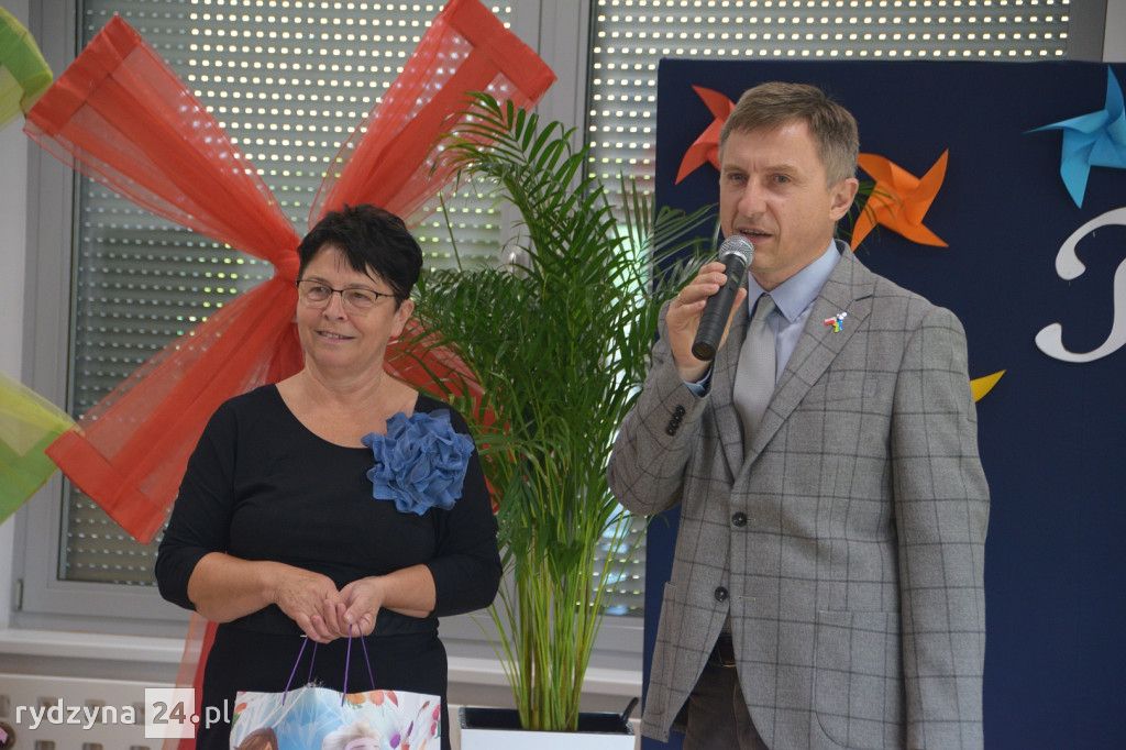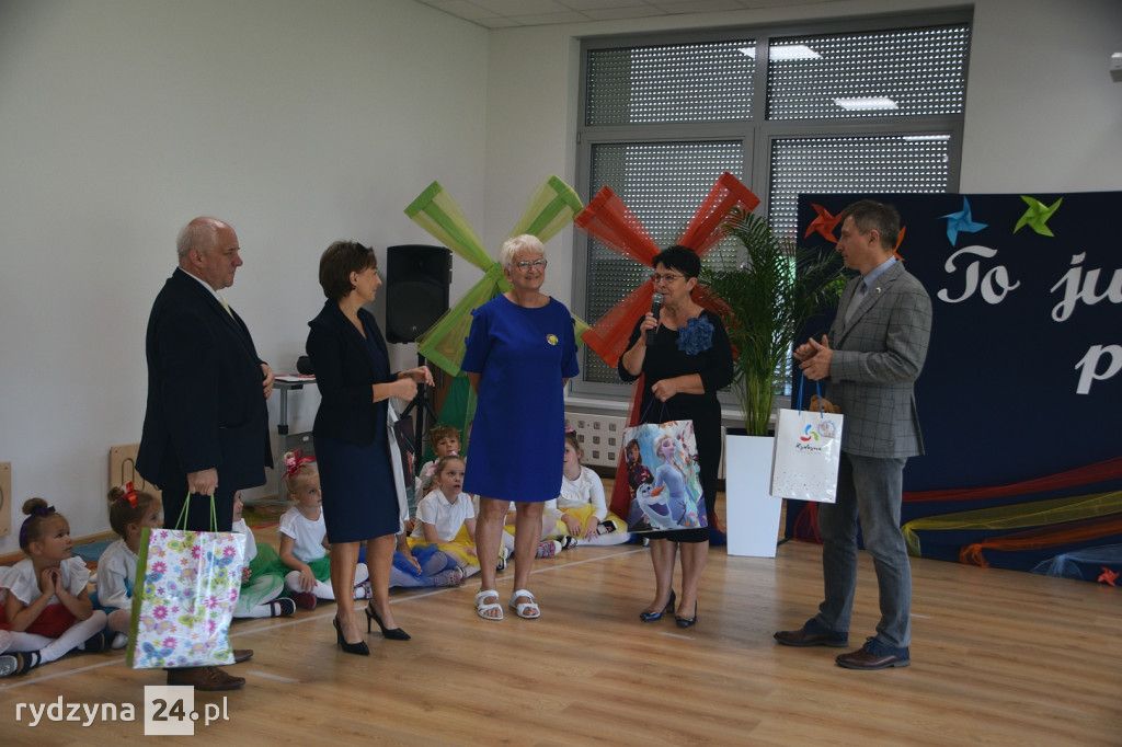 Pani Bogusława Pawlik dyrektor przedszkola Kolorowy Wiatraczek po przywitaniu wszystkich gości, otrzymała kwiaty a także pamiątkowy Grawerton z rąk burmistrza Rydzyny pana Kornela Malcherka oraz przewodniczącego Rady Miasta Rydzyny pana Romana Skiby, oczywiście nie zabrakło również życzeń i prezentów od innych gości uczestniczących w tym wydarzeniu.