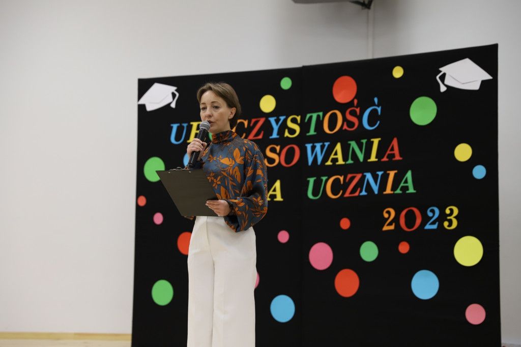 Uczniowie każdej klasy kolejno wchodzili na scenę, gdzie Pani Dyrektor szablą pasowała ich na uczniów.
