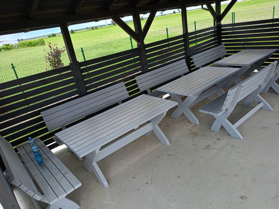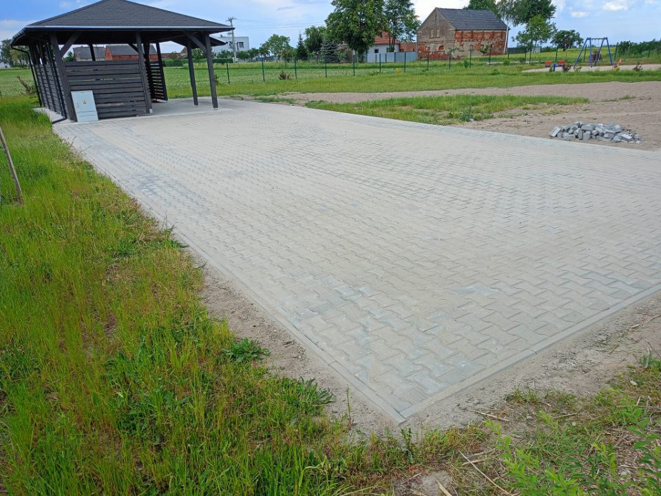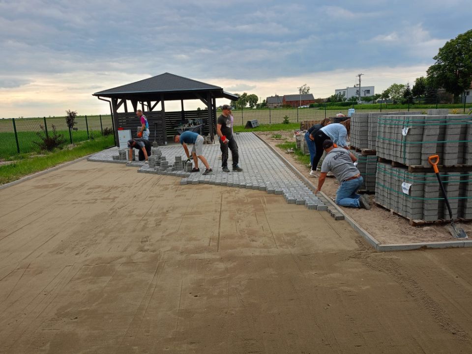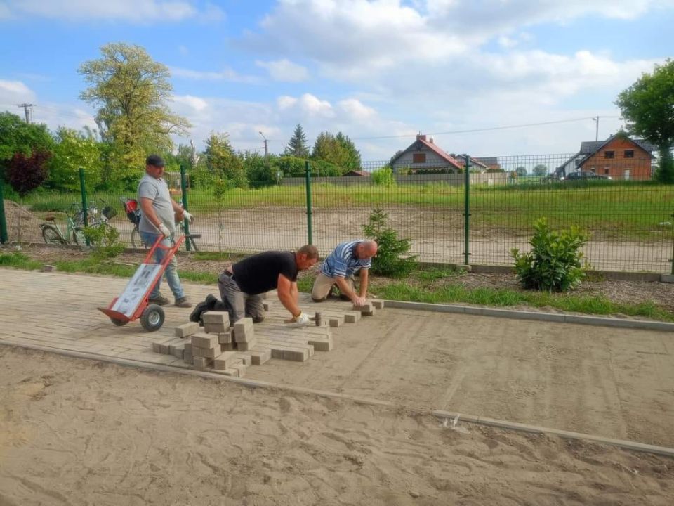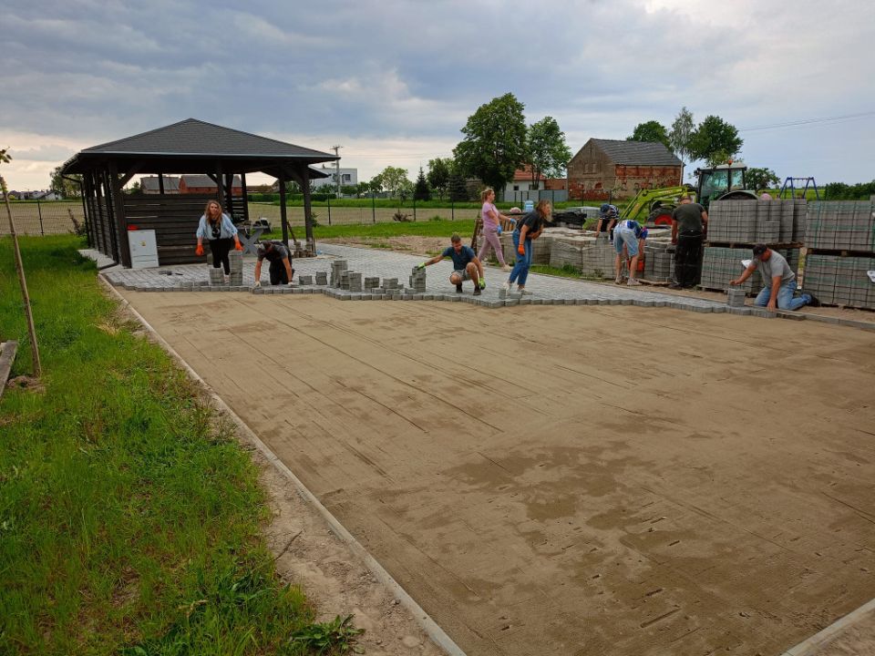 Zaangażowanie mieszkańców nie ograniczało się tylko do układania kostki. Wczesną wiosną pod wiatą na placu pojawiły się nowe, solidne ławki i stoły, wykonane przez StolMar Grzegorz Markiewicz. Dzięki tym udogodnieniom przestrzeń stała się jeszcze bardziej przyjazna i funkcjonalna dla wszystkich użytkowników.