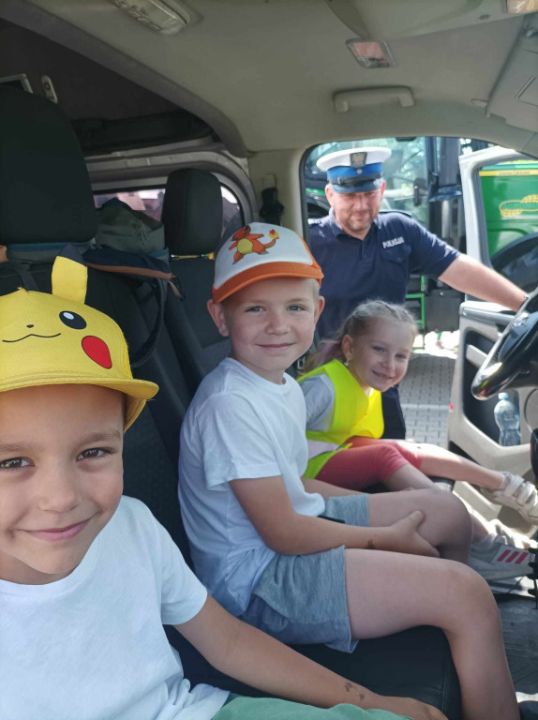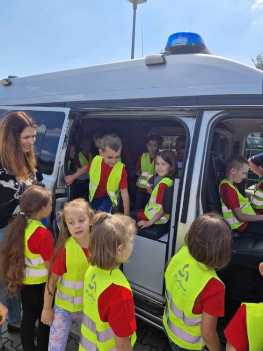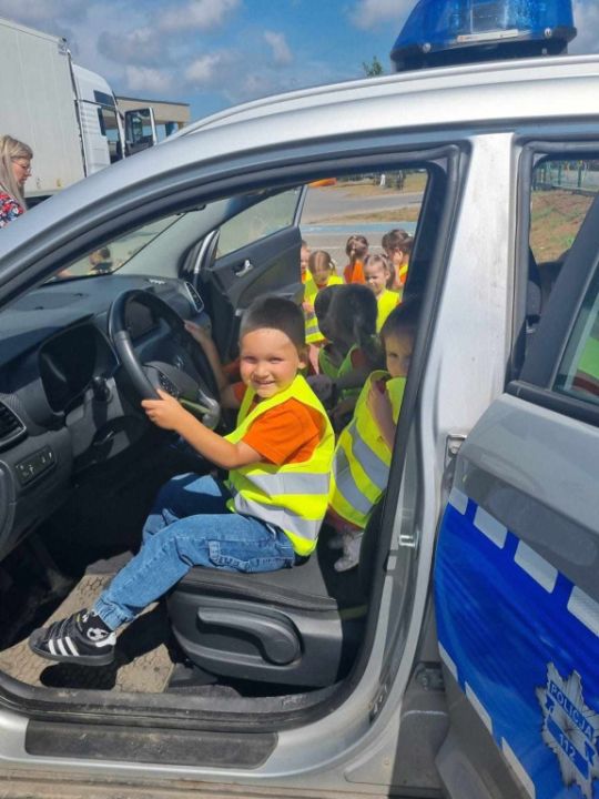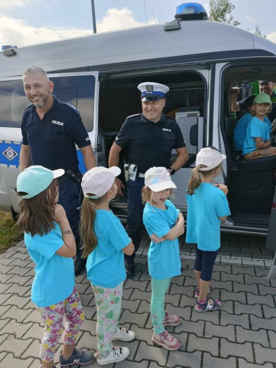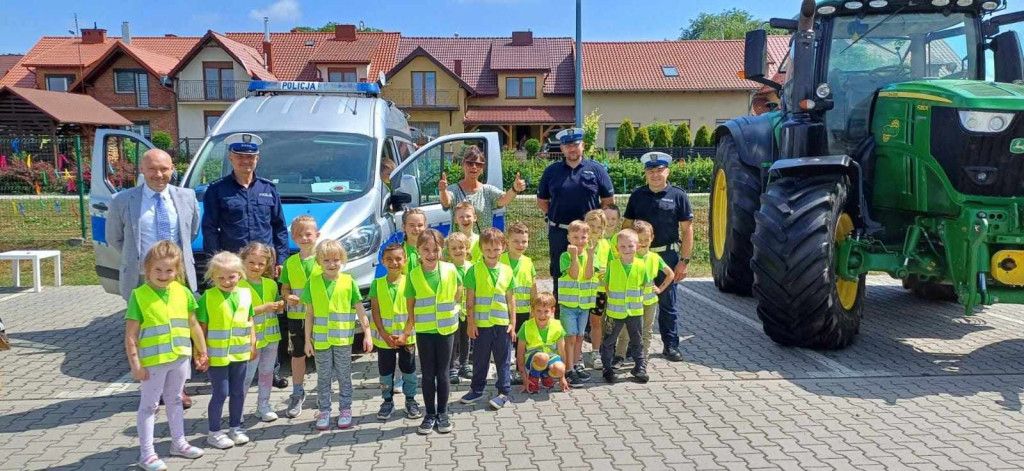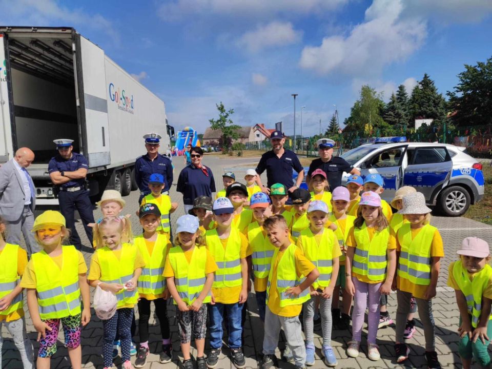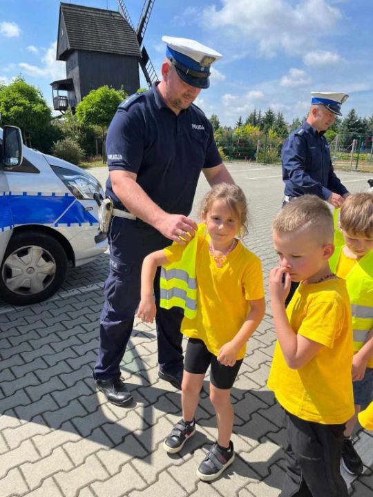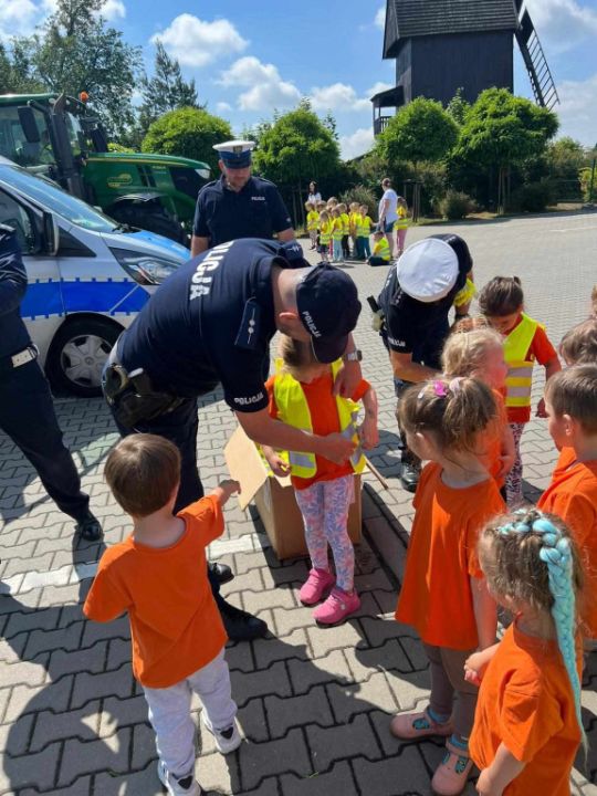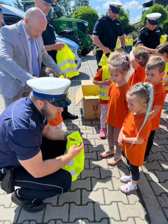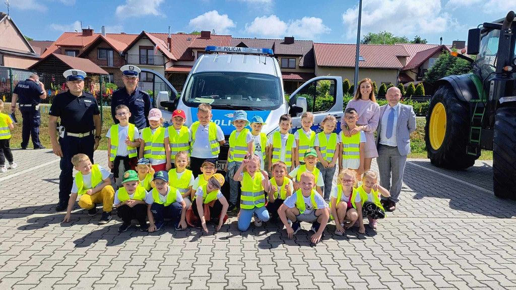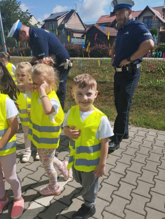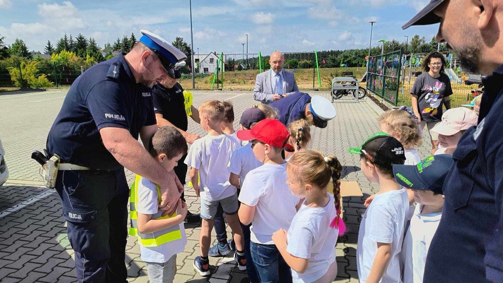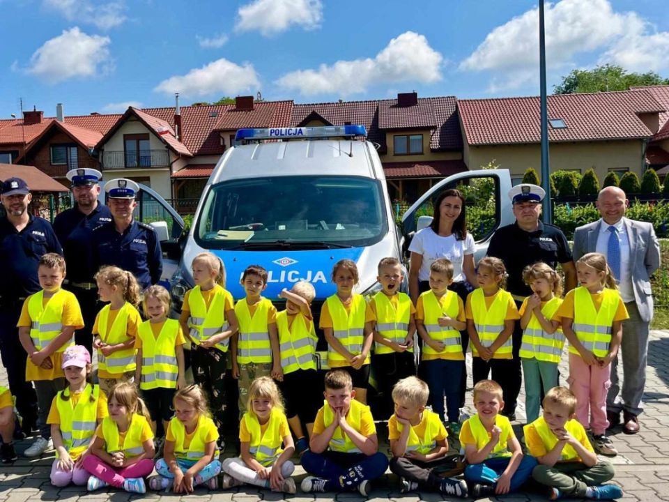 Policjanci, na czele z nadkom. Zbigniewem Krawczykiem, uświadamiali przedszkolaków jak ważna jest widoczność na drodze, a także utrwalali zasady bezpieczeństwa w ruchu drogowym. Dzieci miały również wyjątkową okazję zobaczyć wnętrze radiowozów, co wzbudziło ogromne zainteresowanie i radość.