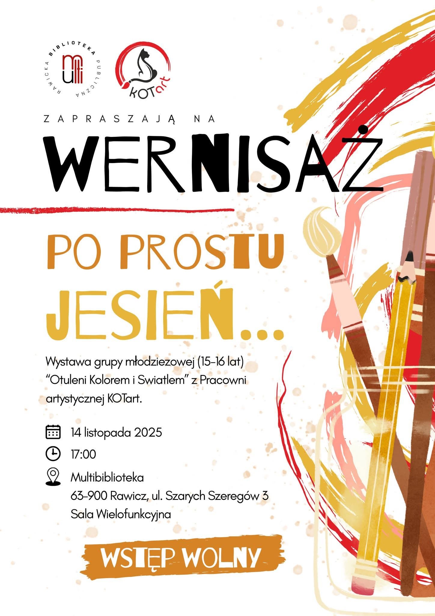 Multibiblioteka w Rawiczu wspólnie z pracownią artystyczną KOtart zaprasza mieszkańców na wyjątkowy wernisaż zatytułowany „Po prostu jesień…”, podczas którego zaprezentowane zostaną prace młodzieżowej grupy twórczej w wieku 15–16 lat „Otuleni Kolorem i Światłem”.