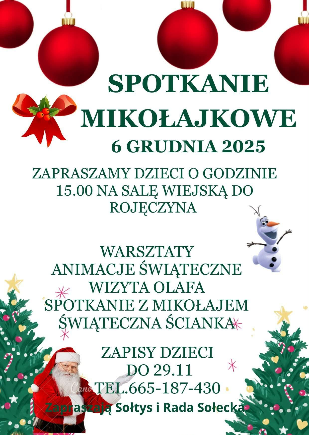 Sołectwo Rojęczyn przygotowało dla najmłodszych wyjątkowe Spotkanie Mikołajkowe, które odbędzie się 6 grudnia 2025 roku. Start wydarzenia zaplanowano na godzinę 15:00 w sali wiejskiej w Rojęczynie.