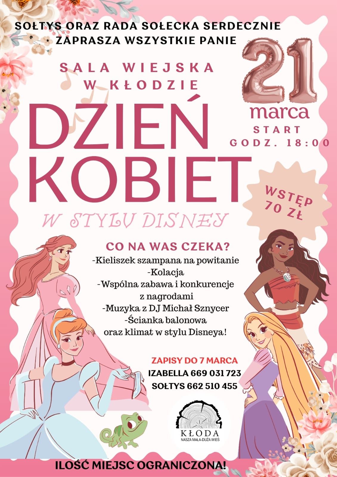 Sołtys oraz Rada Sołecka zapraszają wszystkie panie na wyjątkowe obchody Dnia Kobiet w Kłodzie. Tegoroczna edycja odbędzie się 21 marca o godz. 18:00 w Sali Wiejskiej w Kłodzie i upłynie pod hasłem „Dzień Kobiet w stylu Disney”.