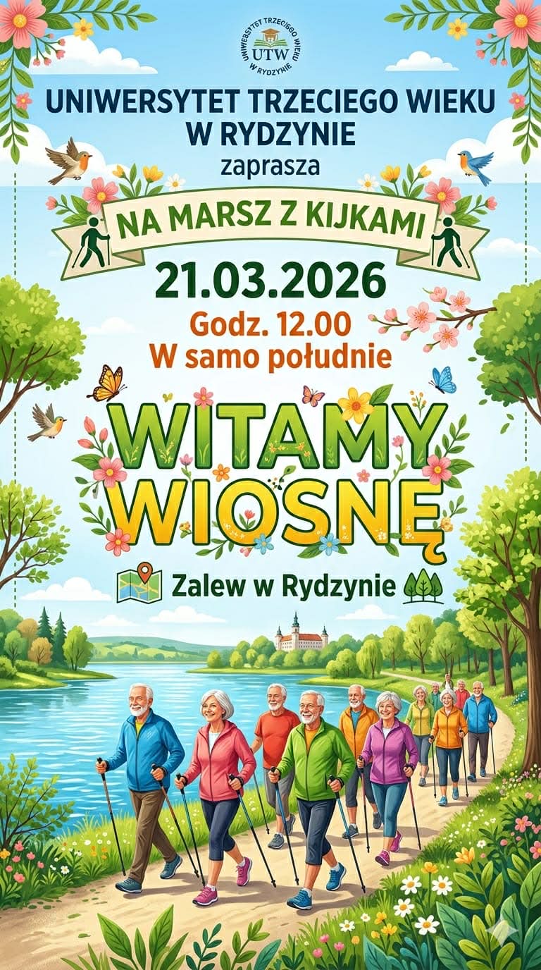 Już 21 marca 2026 r. o godz. 12:00 spotykamy się nad Zalewem w Rydzynie, aby wspólnie ruszyć na Marsz z Kijkami i symbolicznie przywitać najpiękniejszą porę roku! 🌸