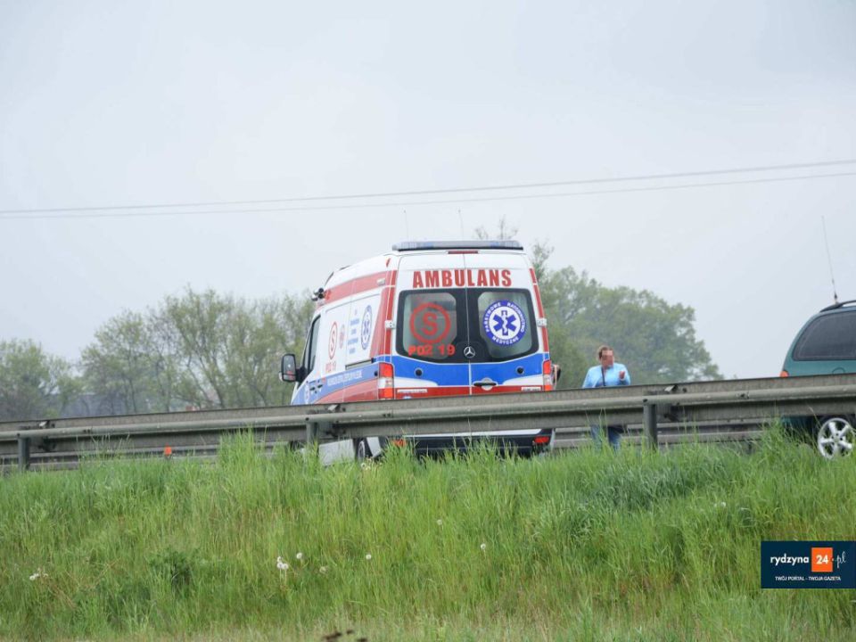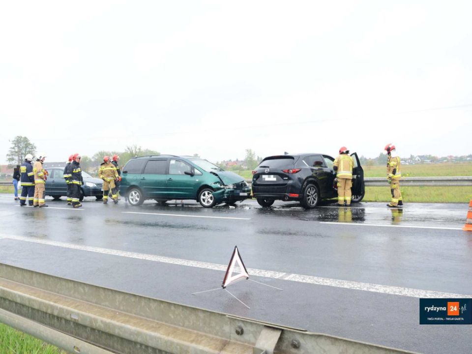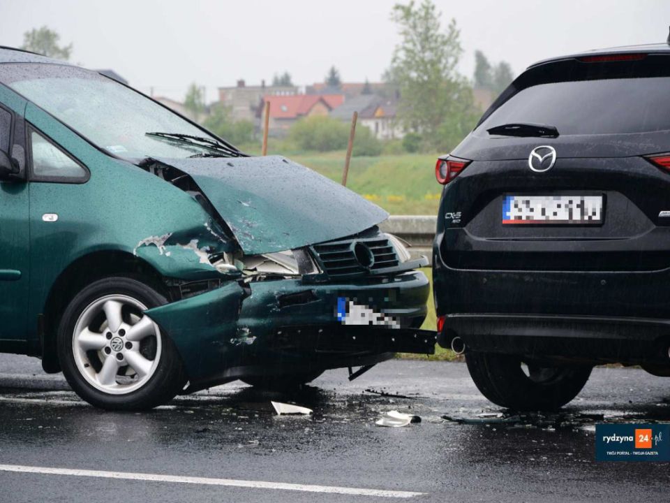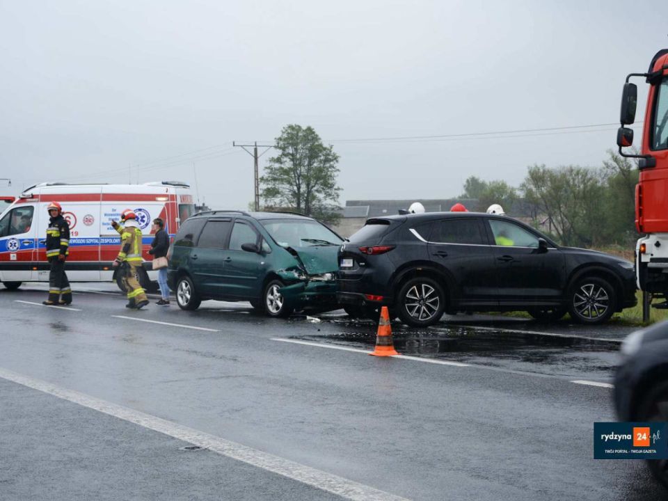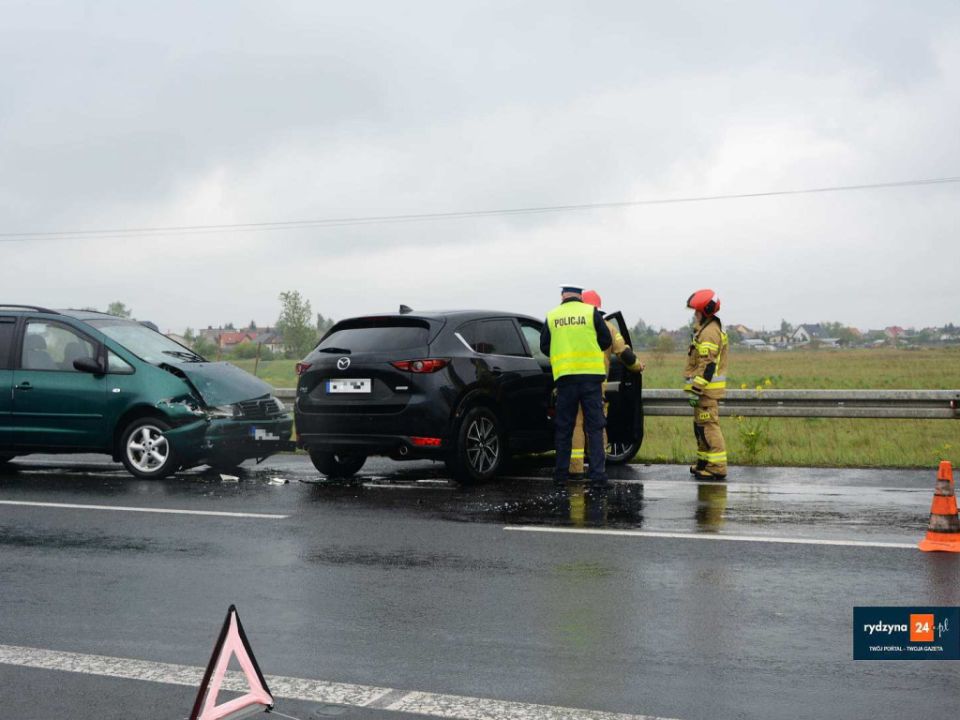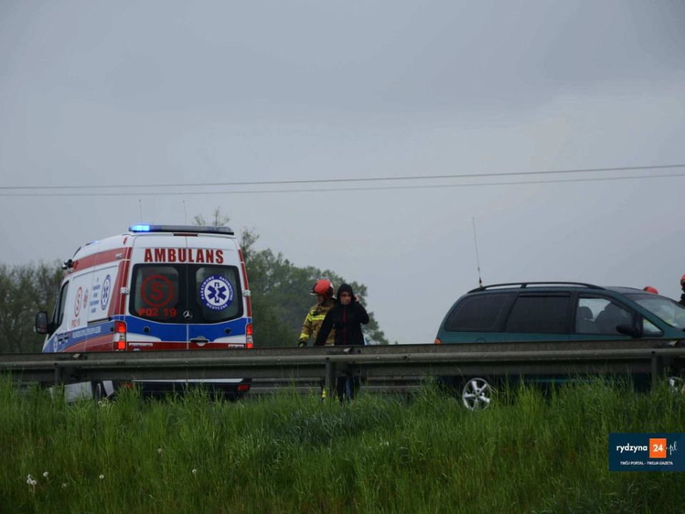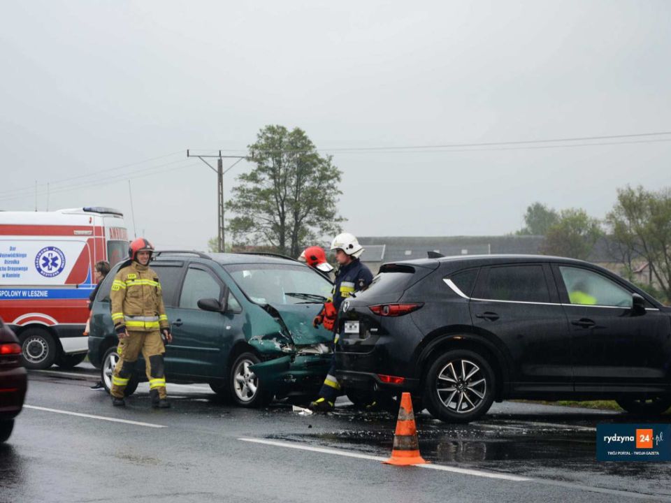 Dwa auta Mazda i Volkswagen uczestniczyły w zderzeniu na obwodnicy Rydzyny na wskości strefy przemysłowej. Na 9 osób tylko jedna osoba uskarżała się na bóle klatki piersiowej. Przybyli na miejsce ratownicy medyczni przebadali i stwierdzili, że nie ma zagrożenia. Na miejsce przyjechały jednostki PSP  Leszno i OSP  Rydzyna oraz Policja.