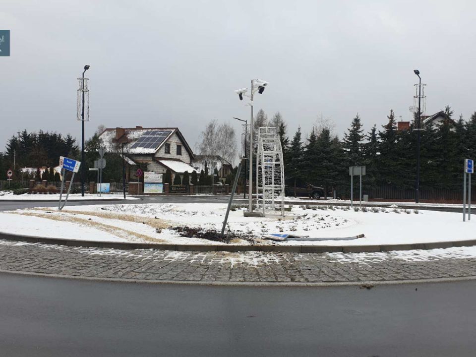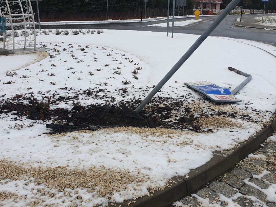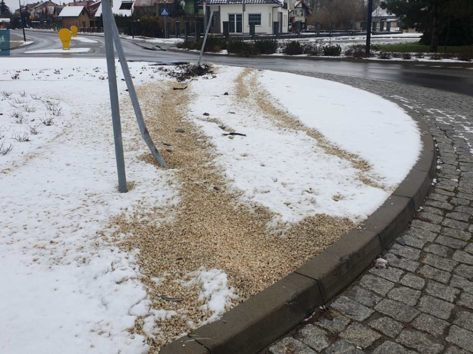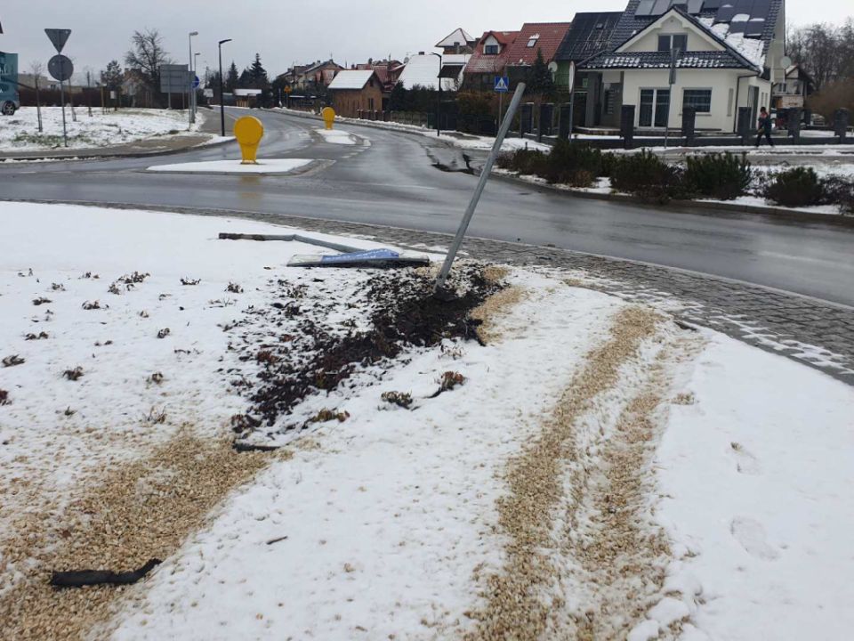 Kierujący samochodem osobowym przejechał prosto przez rondo, niszcząc znaki oraz teren.