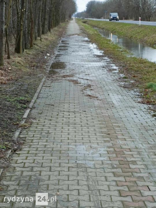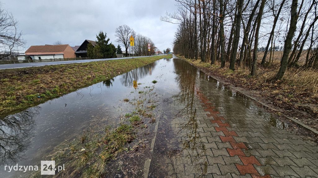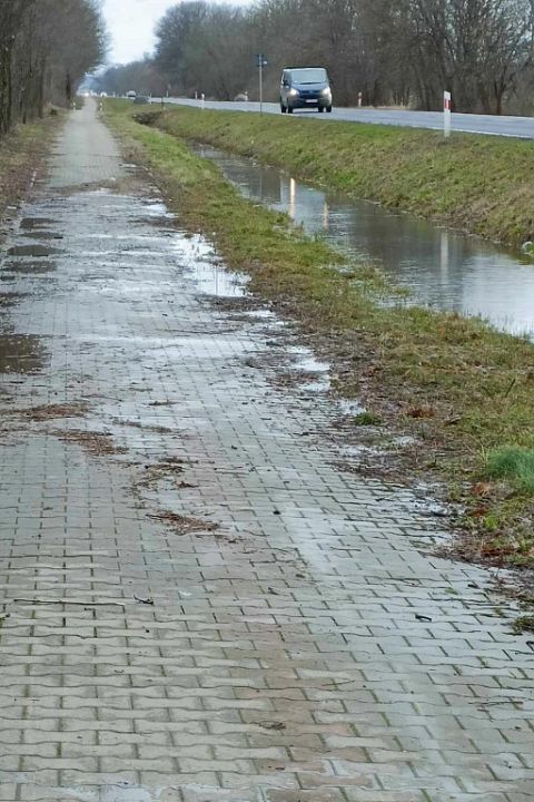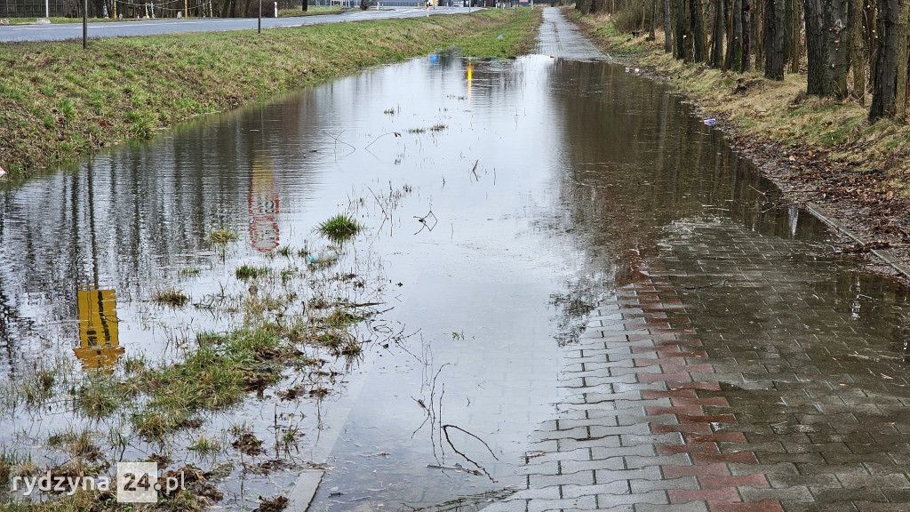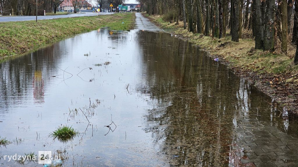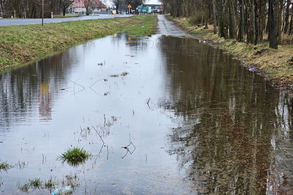 Po intensywnych opadach deszczu, ścieżka rowerowa, biegnąca wzdłuż drogi wojewódzkiej między Kłodą a Augustowem, została zalana.