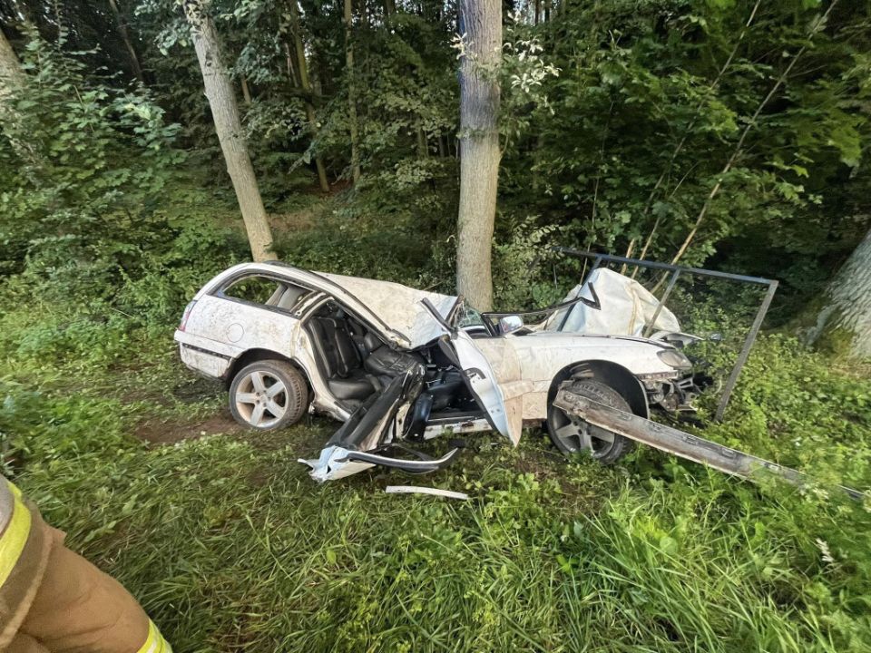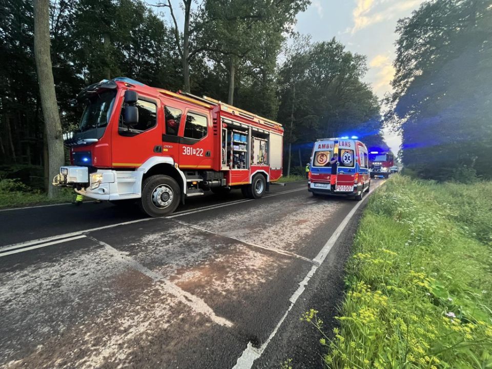 -Opis: Auto osobowe uderzyło w drzewo, a osoby były zakleszczone w pojeździe. Początkowo zaplanowane było lądowanie śmigłowca LPR, jednak dyspozycja została anulowana.